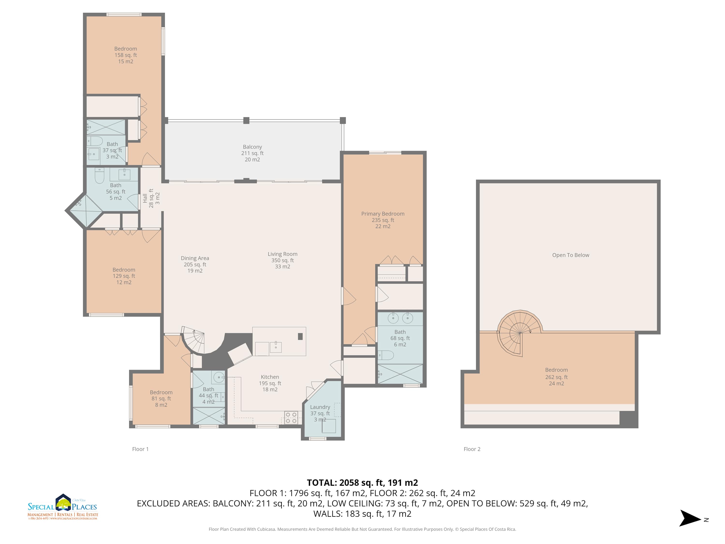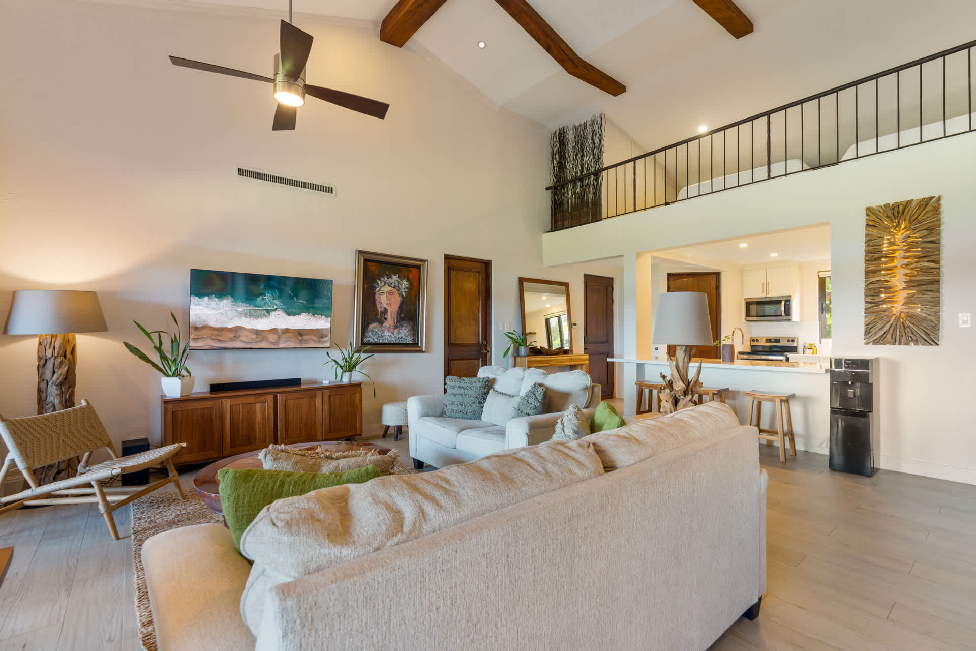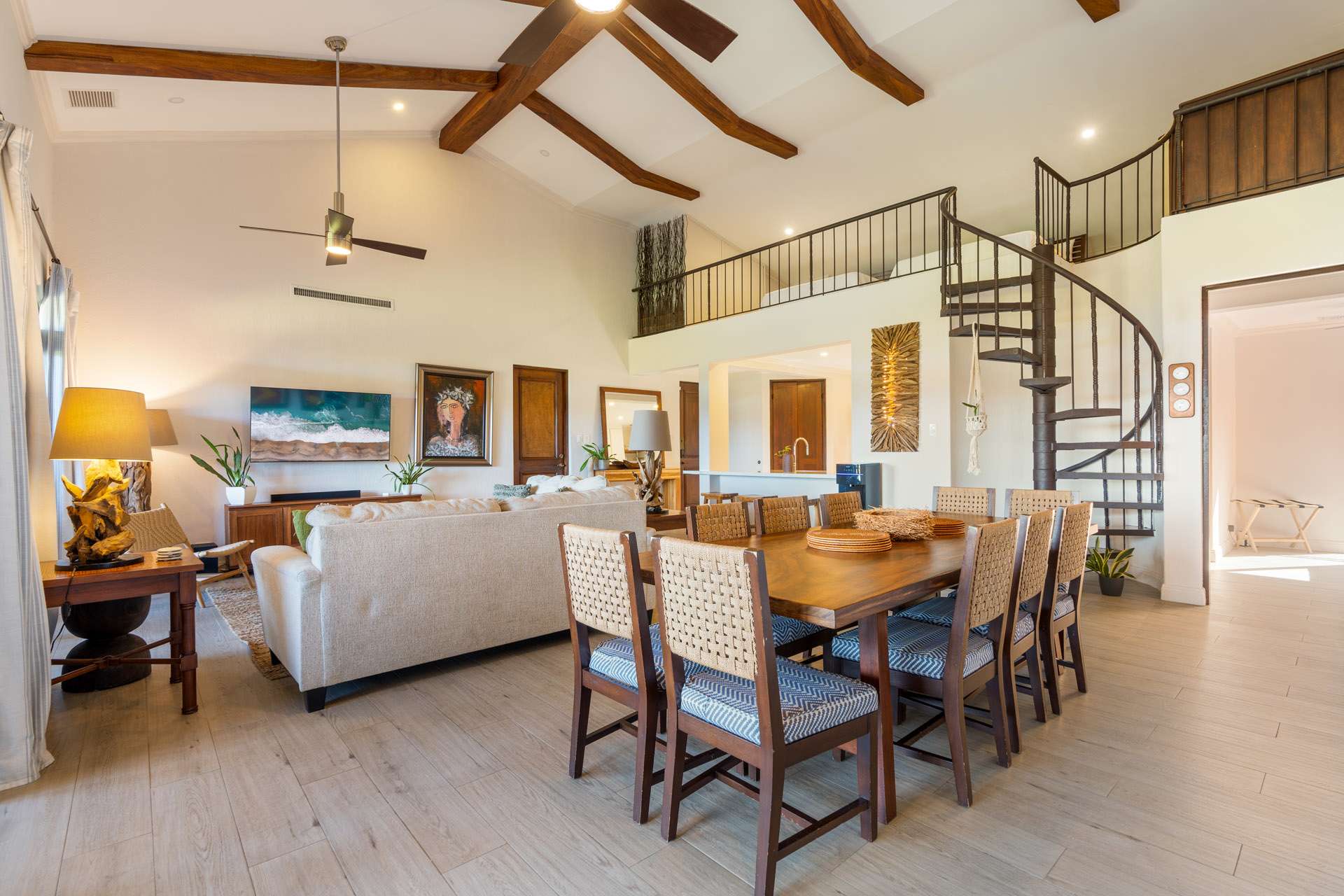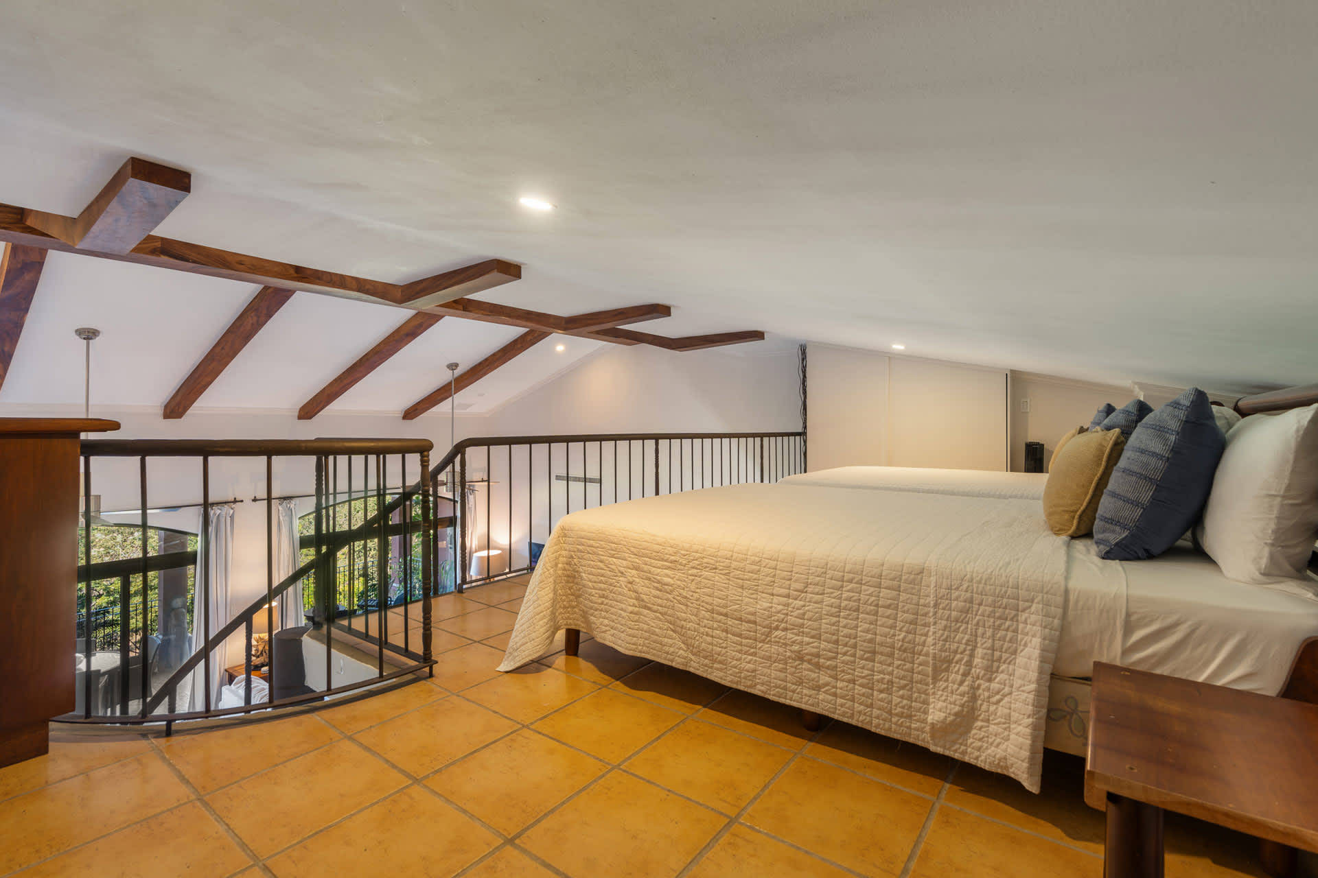The living space features a stylish living room with soaring beamed ceilings and tropical decor, as well as a fully equipped chef’s kitchen with high-end fixtures and state-of-the-art appliances. The living space opens to a covered balcony, where you can spot local wildlife, including howler monkeys and tropical birds. The spiral staircase at the condo’s center leads to a spacious loft with spectacular views.