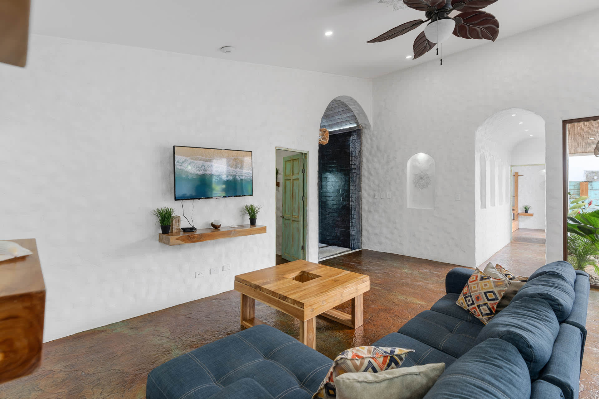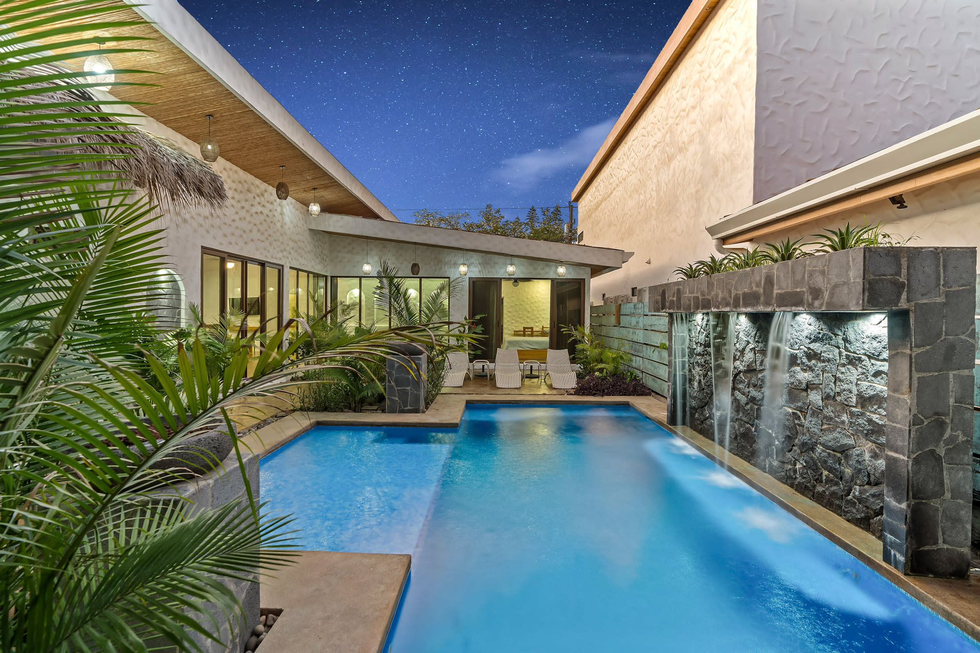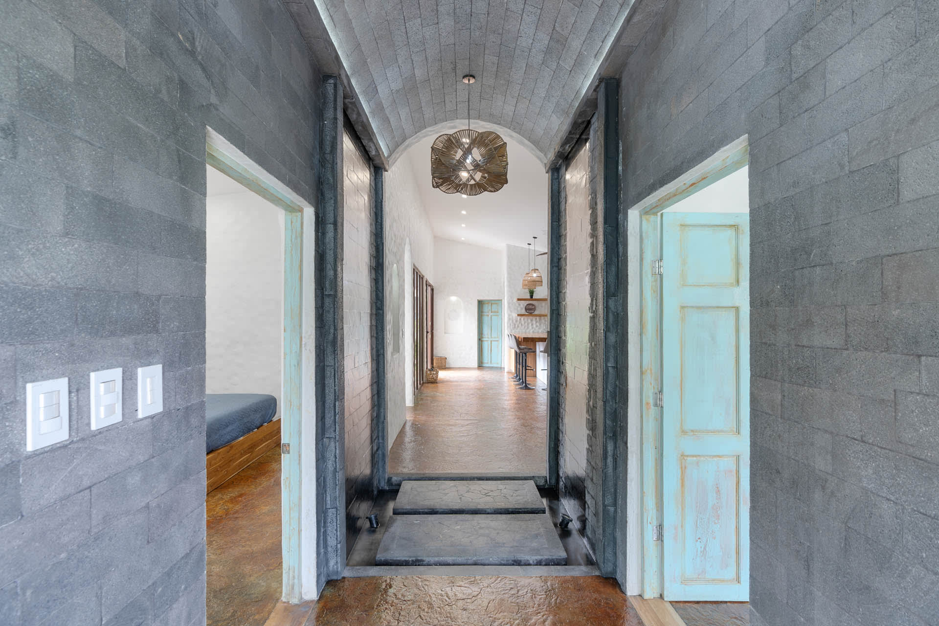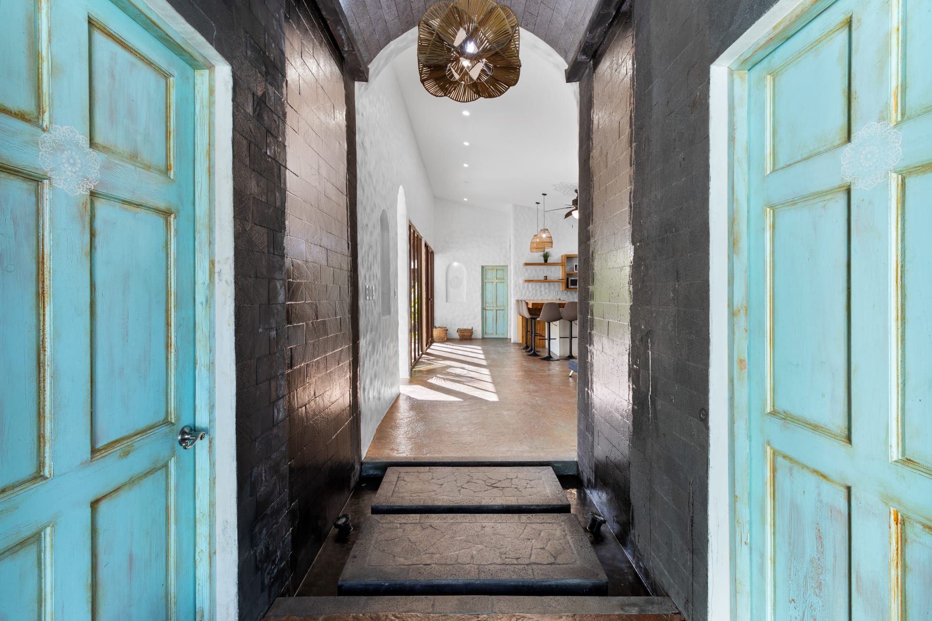 Guests at Casa Estrella will be greeted by an arched entryway featuring a stylish chandelier and floating steps, flanked by natural stone walls with a waterfall feature on each side, which sets the mood for a laid-back retreat. This hallway leads to a spacious, open-concept floor plan that features a living room, kitchen, and tall windows offering a picturesque view of the property’s lush outdoor oasis.