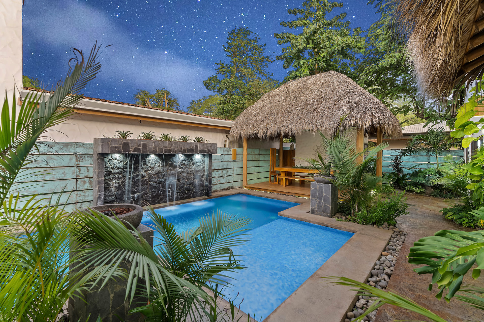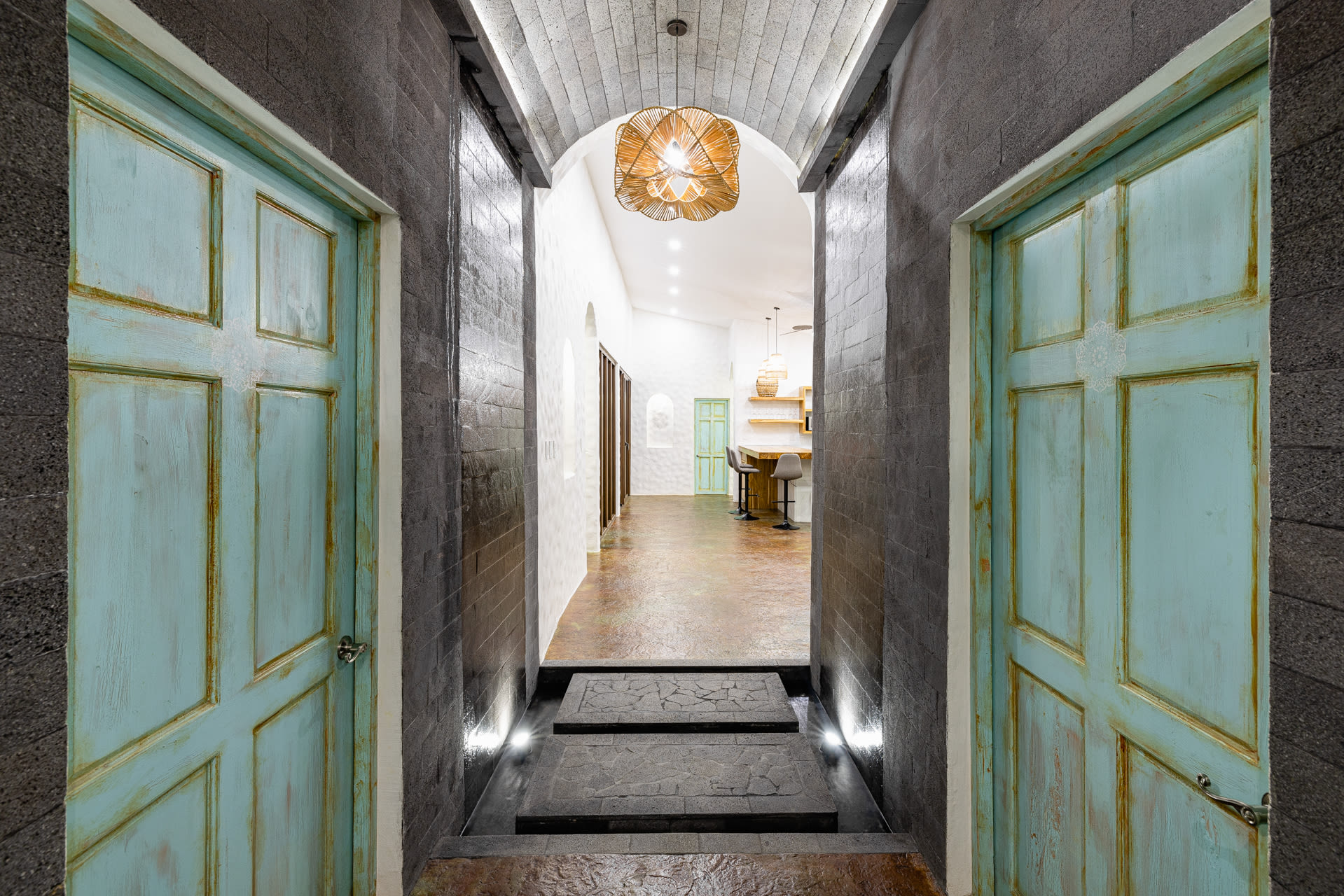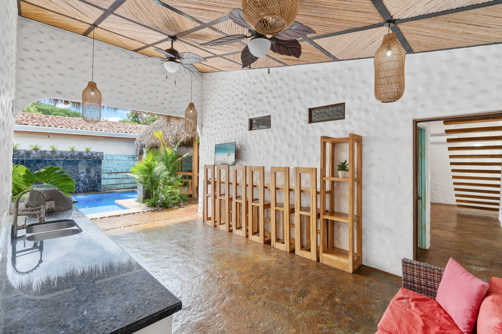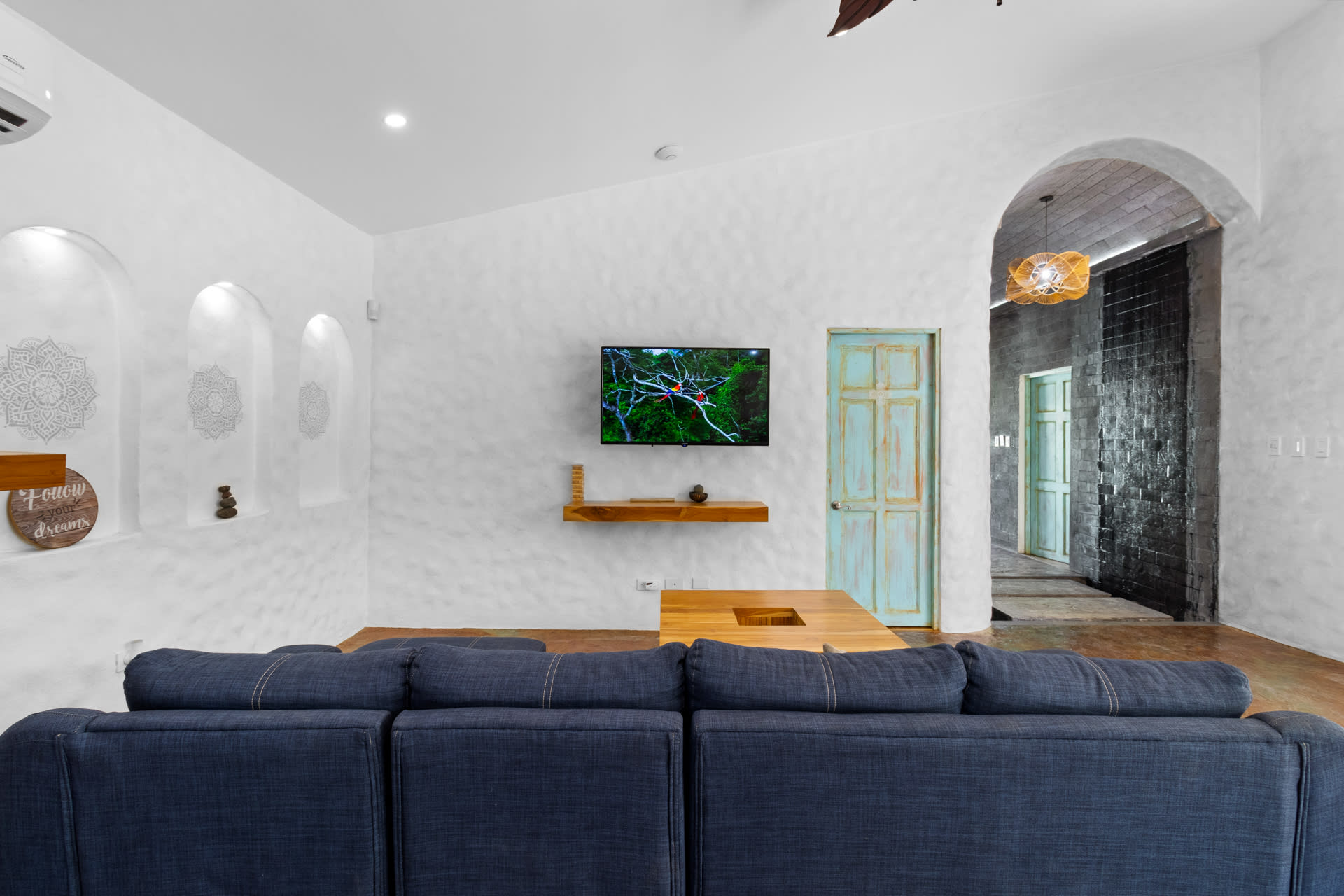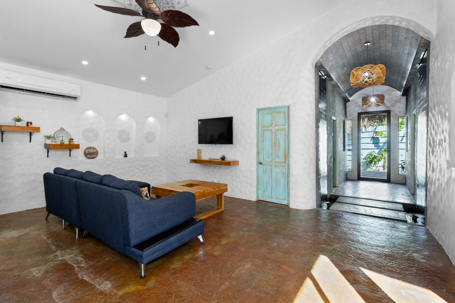 Guests at Casa Estrella will be greeted by an arched entryway featuring a stylish chandelier and floating steps, flanked by natural stone walls with a waterfall feature on each side, which sets the mood for a laid-back retreat. This hallway leads to a spacious, open-concept floor plan that features a living room, kitchen, and tall windows offering a picturesque view of the property’s lush outdoor oasis.