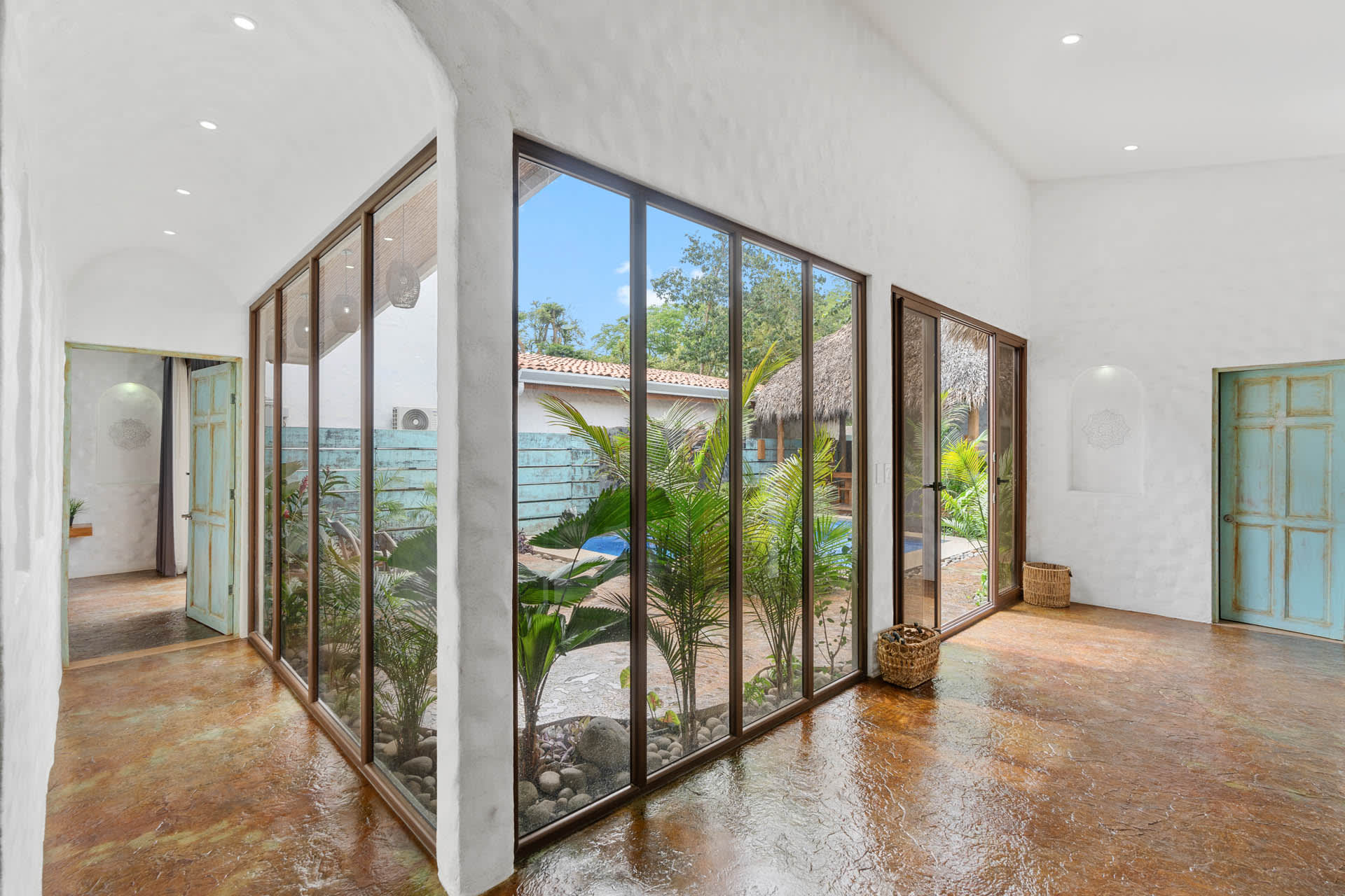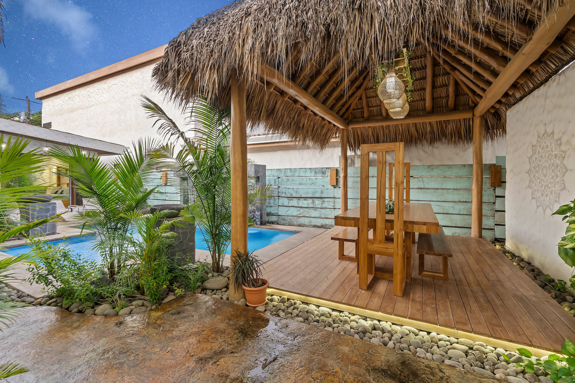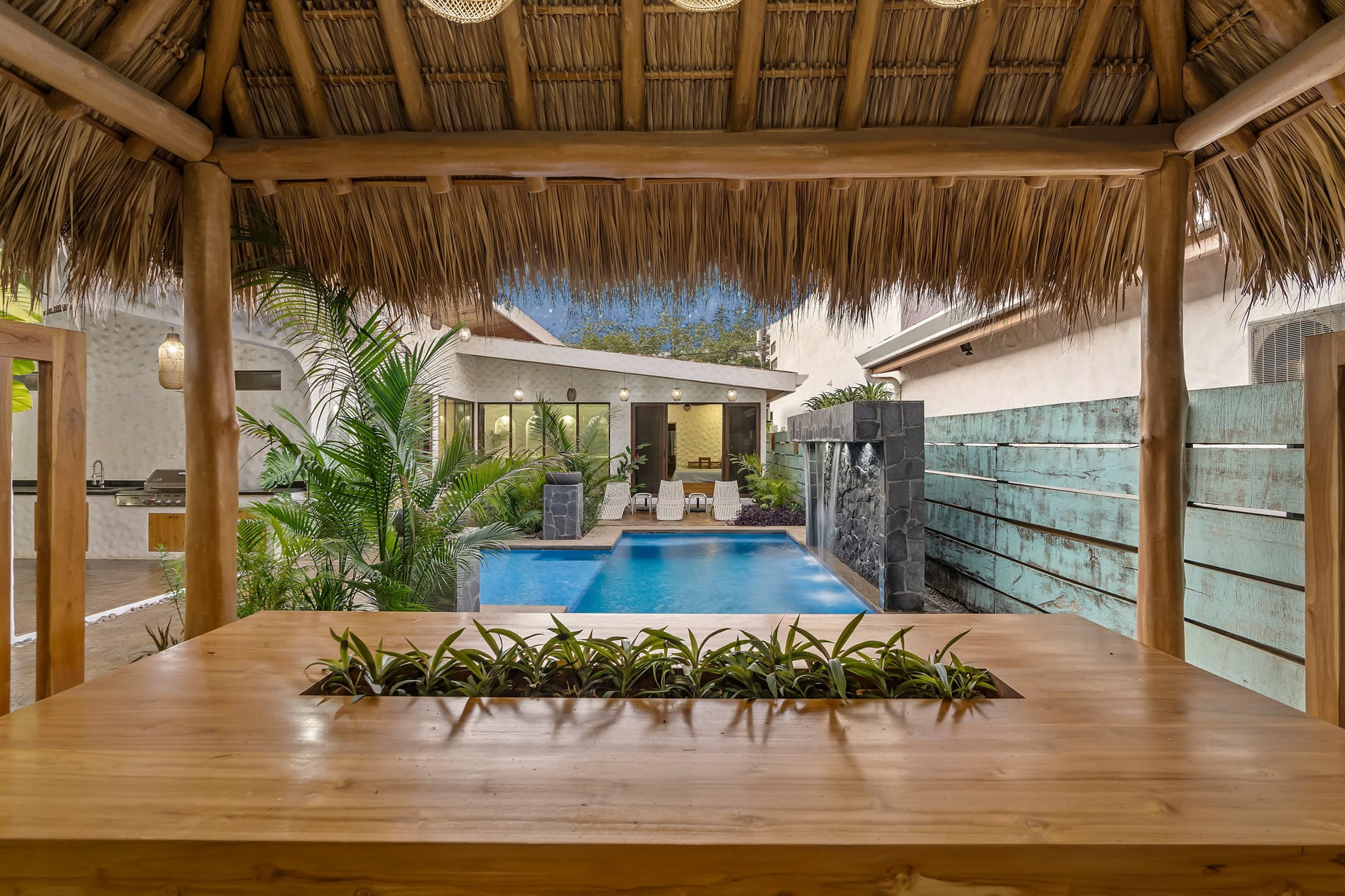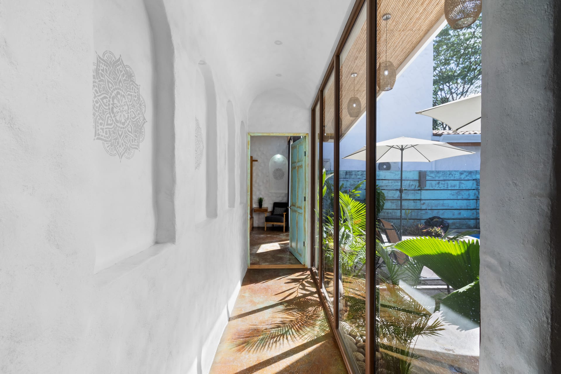 Guests at Casa Estrella will be greeted by an arched entryway featuring a stylish chandelier and floating steps, flanked by natural stone walls with a waterfall feature on each side, which sets the mood for a laid-back retreat. This hallway leads to a spacious, open-concept floor plan that features a living room, kitchen, and tall windows offering a picturesque view of the property’s lush outdoor oasis.