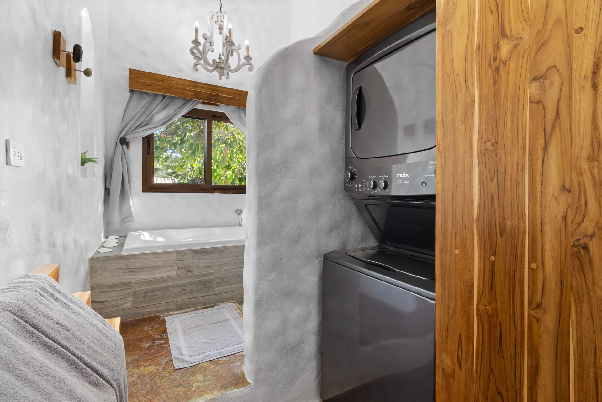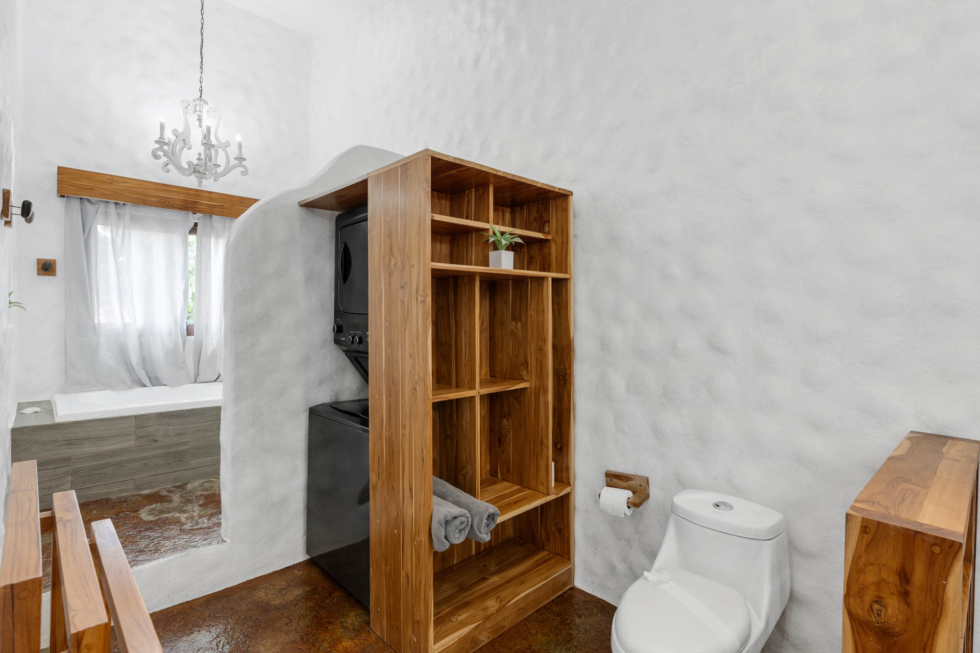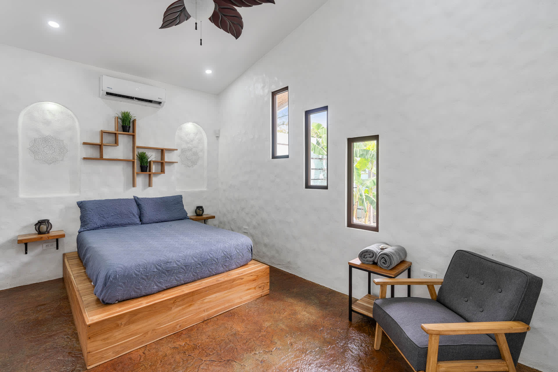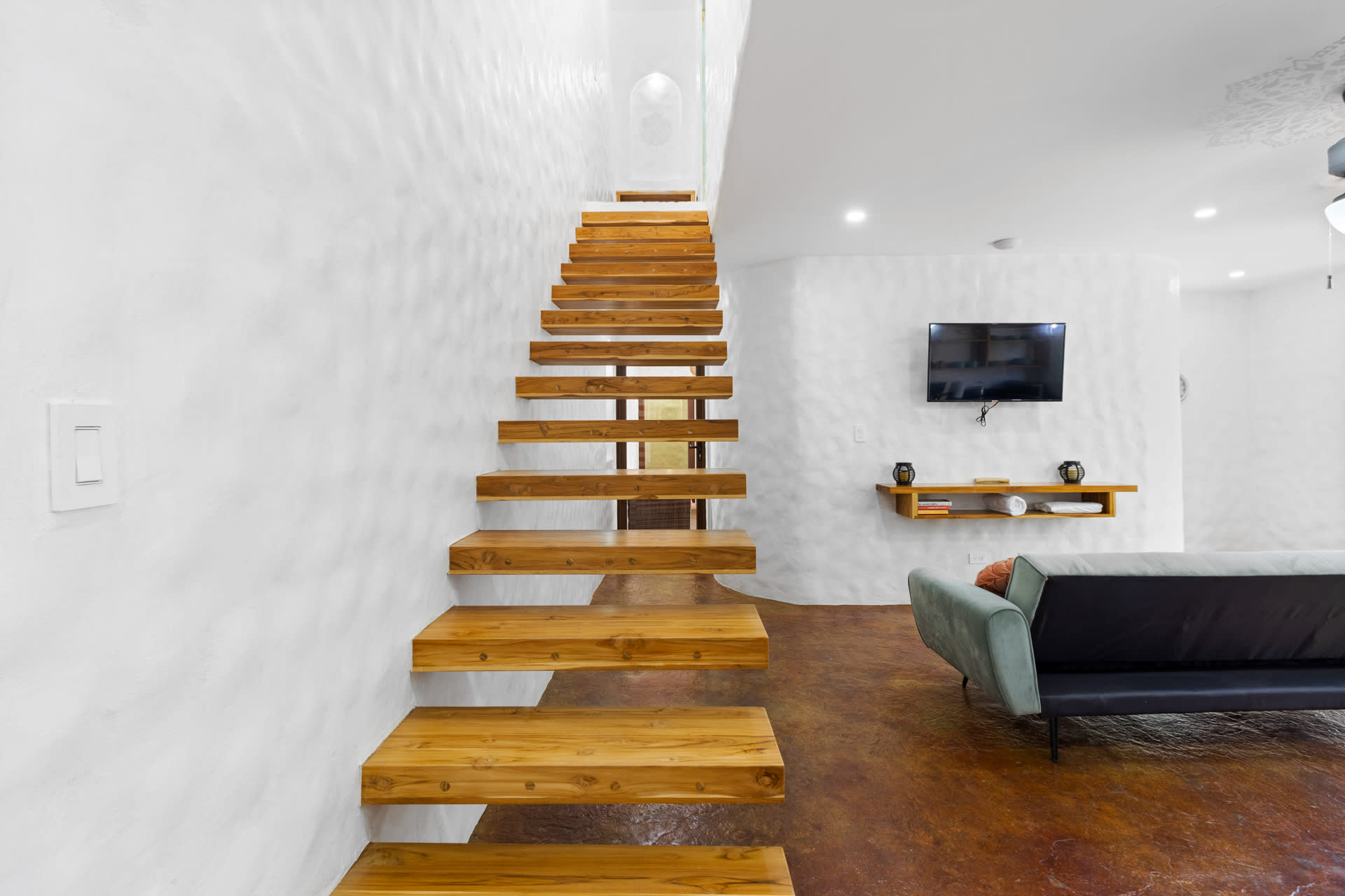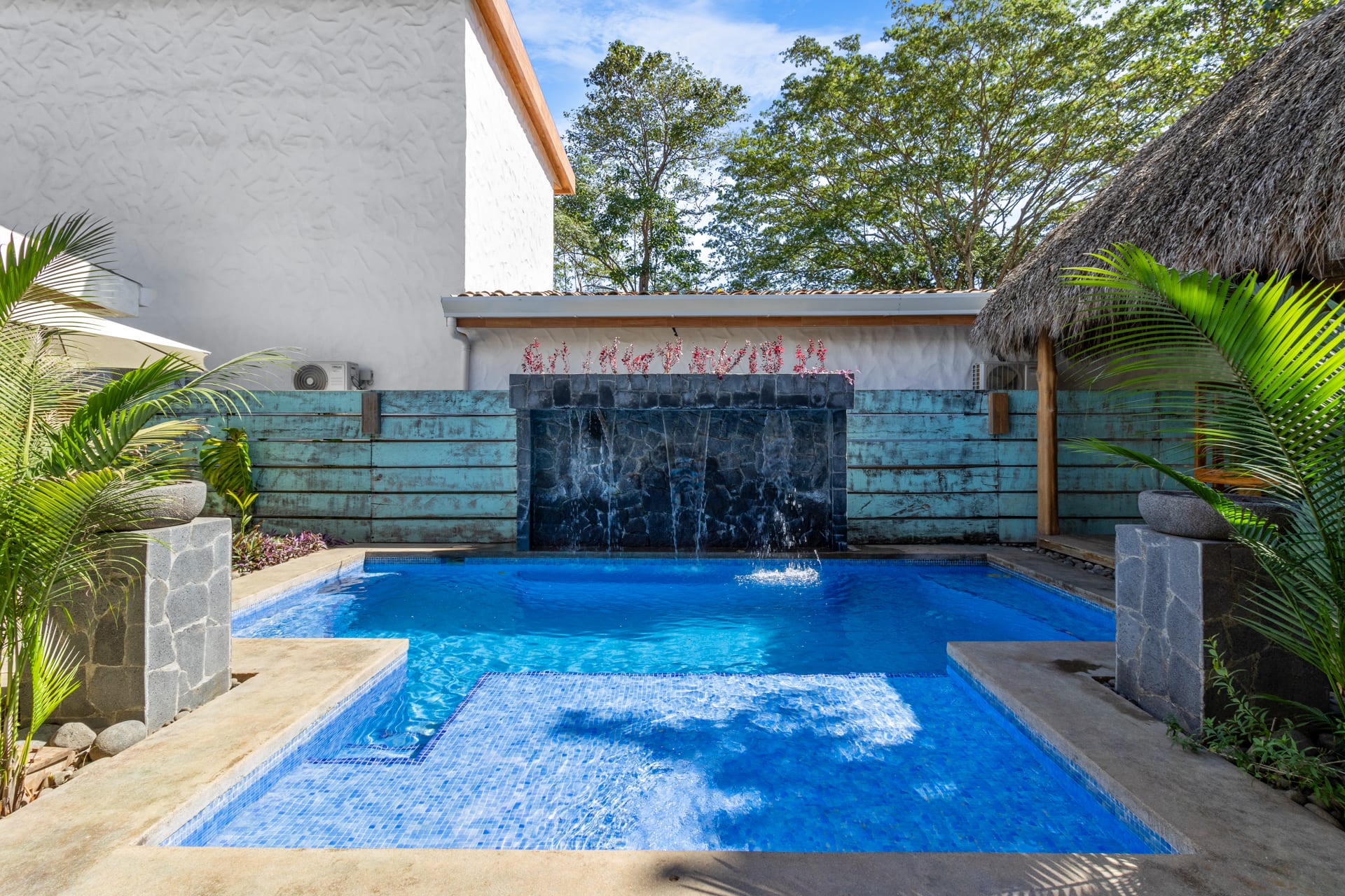 Guests at Casa Estrella will be greeted by an arched entryway featuring a stylish chandelier and floating steps, flanked by natural stone walls with a waterfall feature on each side, which sets the mood for a laid-back retreat. This hallway leads to a spacious, open-concept floor plan that features a living room, kitchen, and tall windows offering a picturesque view of the property’s lush outdoor oasis.