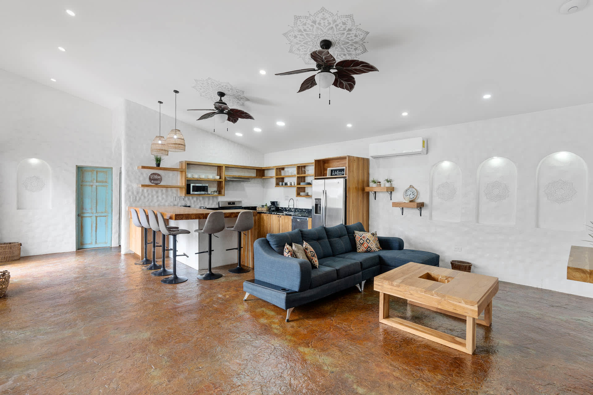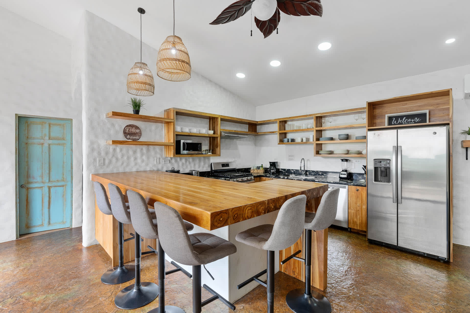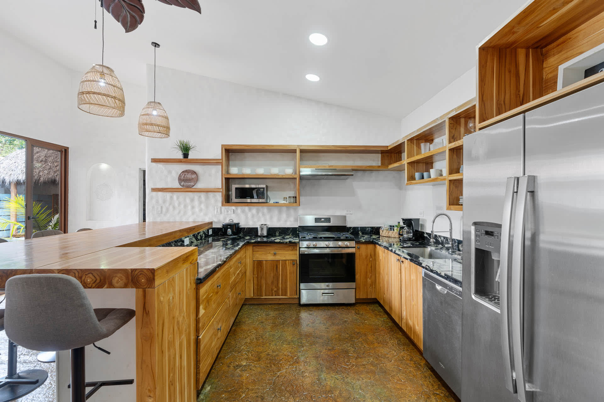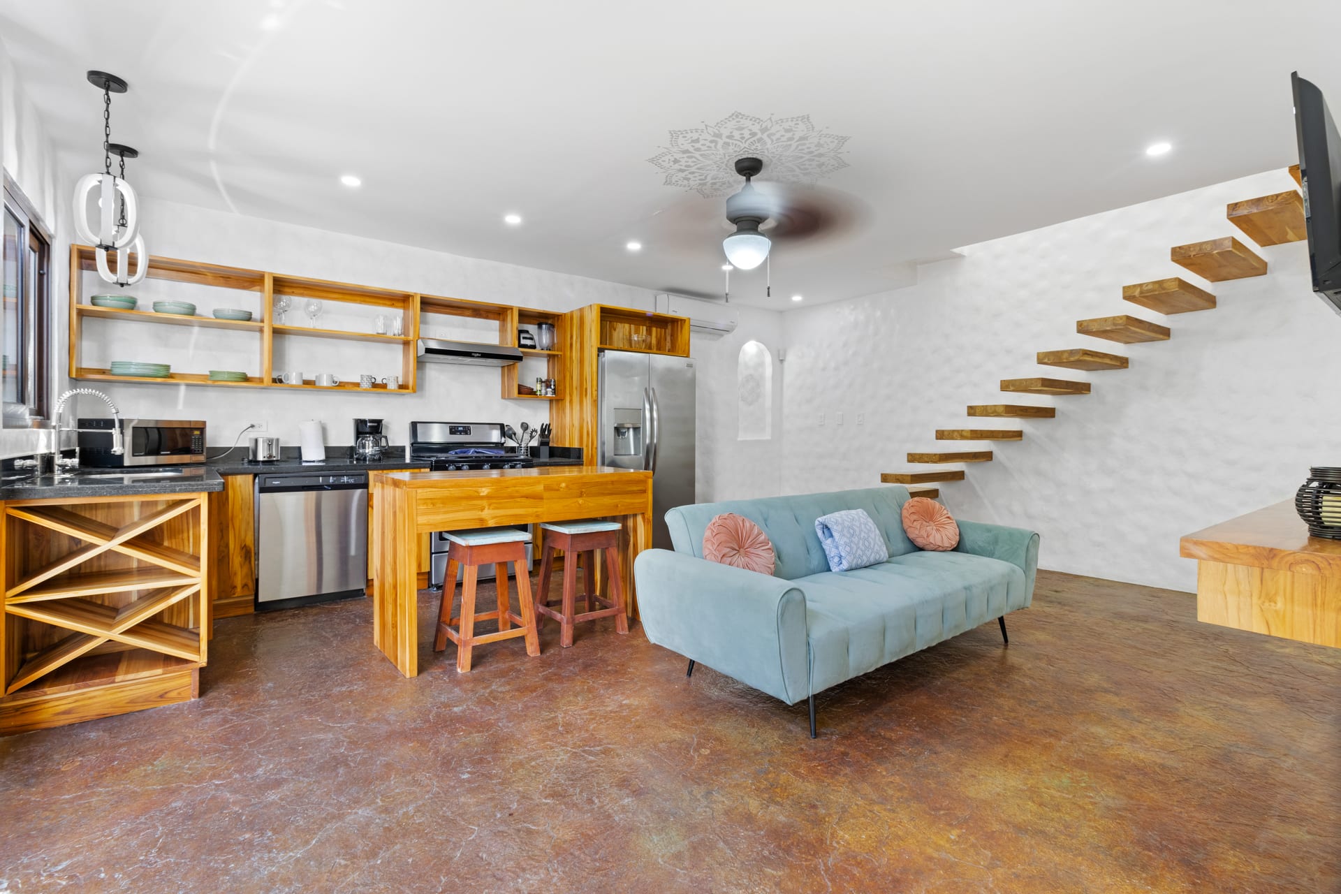 The living room showcases a stylish blue sofa with colorful throw pillows, a flat-screen TV, and a coffee table and floating shelves made from natural wood. The well-lit kitchen is a chef’s dream, featuring high-end granite and marble countertops, open shelving, and cabinets crafted from teak wood, alongside pristine stainless steel appliances, including an oven, gas stove, large refrigerator, freezer, dishwasher, microwave, and a farmhouse sink. The space also features an oversized teak wood island that doubles as a breakfast bar, situated under stylish two rattan light fixtures.