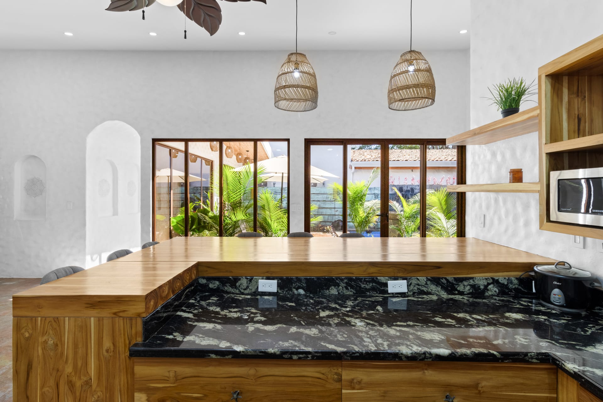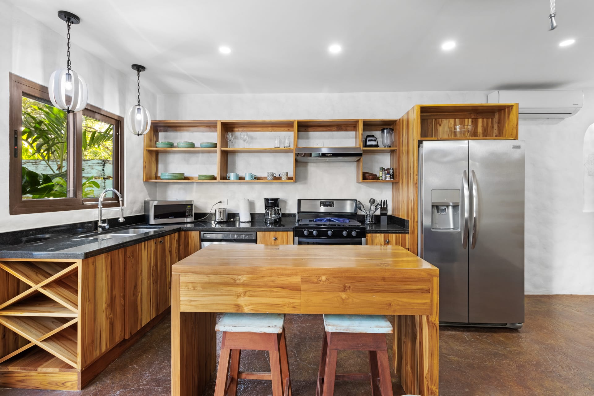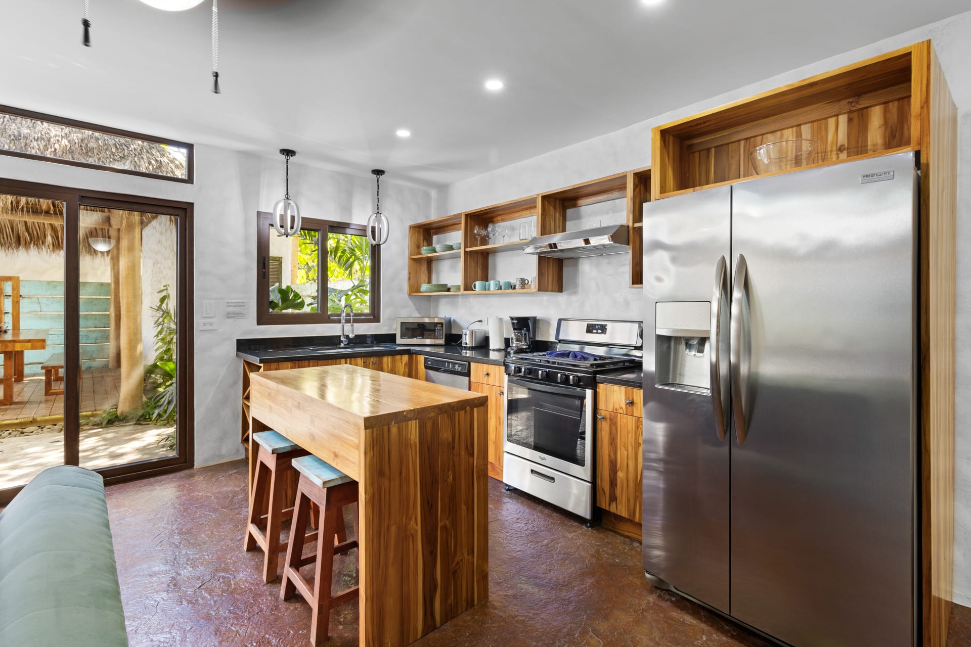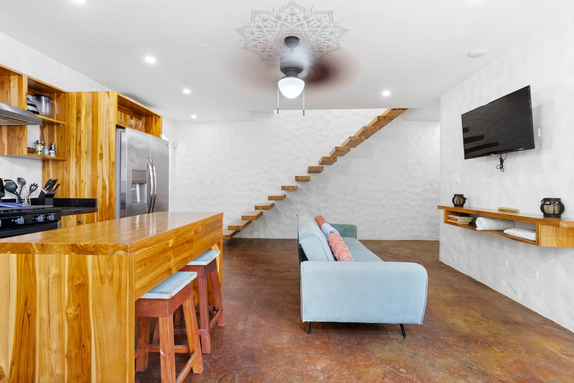 The living room showcases a stylish blue sofa with colorful throw pillows, a flat-screen TV, and a coffee table and floating shelves made from natural wood. The well-lit kitchen is a chef’s dream, featuring high-end granite and marble countertops, open shelving, and cabinets crafted from teak wood, alongside pristine stainless steel appliances, including an oven, gas stove, large refrigerator, freezer, dishwasher, microwave, and a farmhouse sink. The space also features an oversized teak wood island that doubles as a breakfast bar, situated under stylish two rattan light fixtures.
