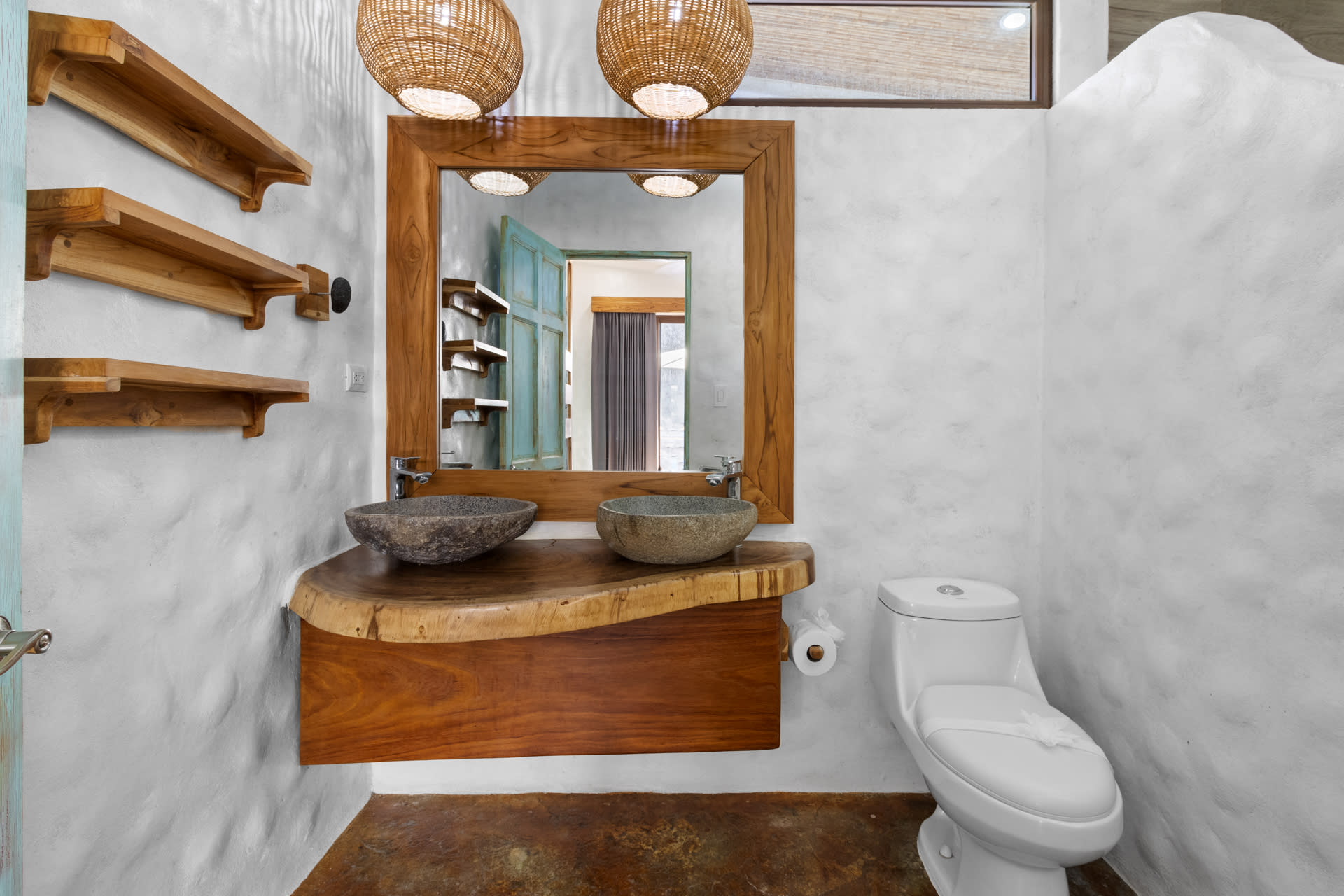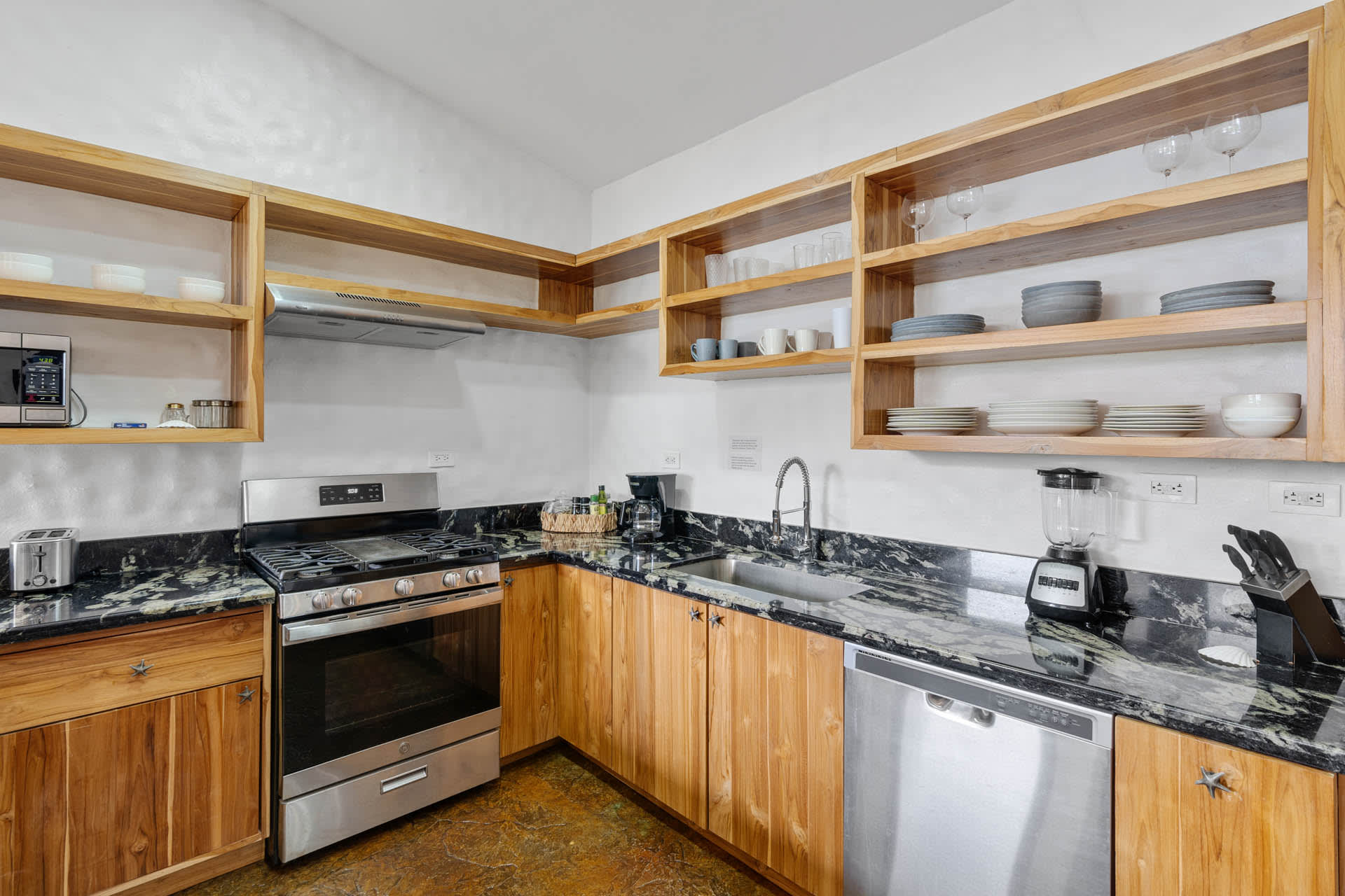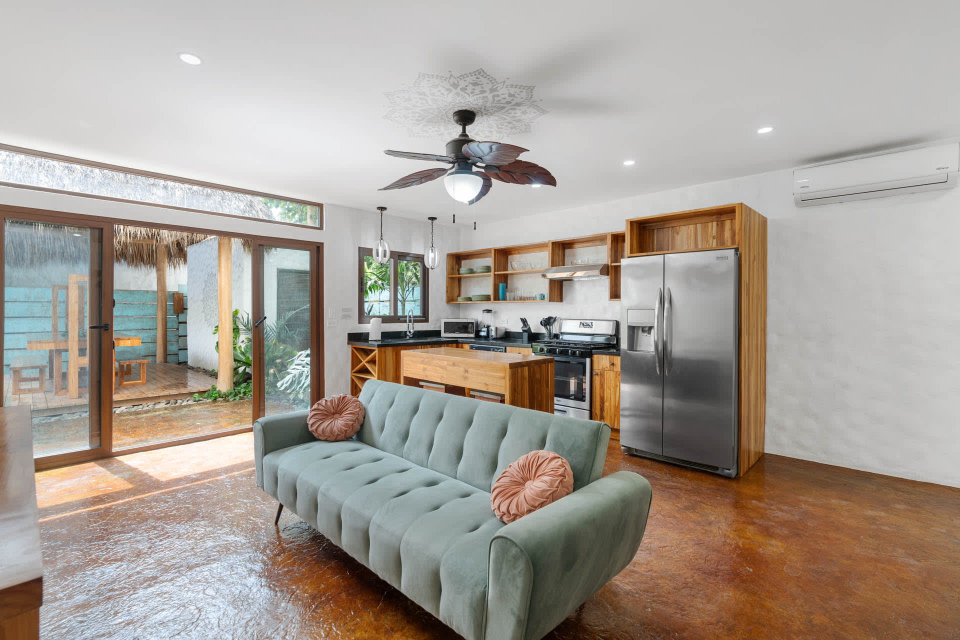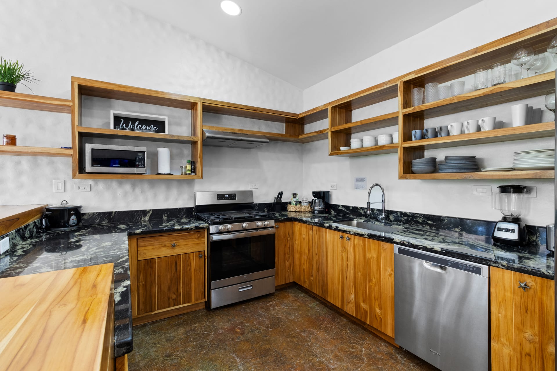 The living room showcases a stylish blue sofa with colorful throw pillows, a flat-screen TV, and a coffee table and floating shelves made from natural wood. The well-lit kitchen is a chef’s dream, featuring high-end granite and marble countertops, open shelving, and cabinets crafted from teak wood, alongside pristine stainless steel appliances, including an oven, gas stove, large refrigerator, freezer, dishwasher, microwave, and a farmhouse sink. The space also features an oversized teak wood island that doubles as a breakfast bar, situated under stylish two rattan light fixtures.