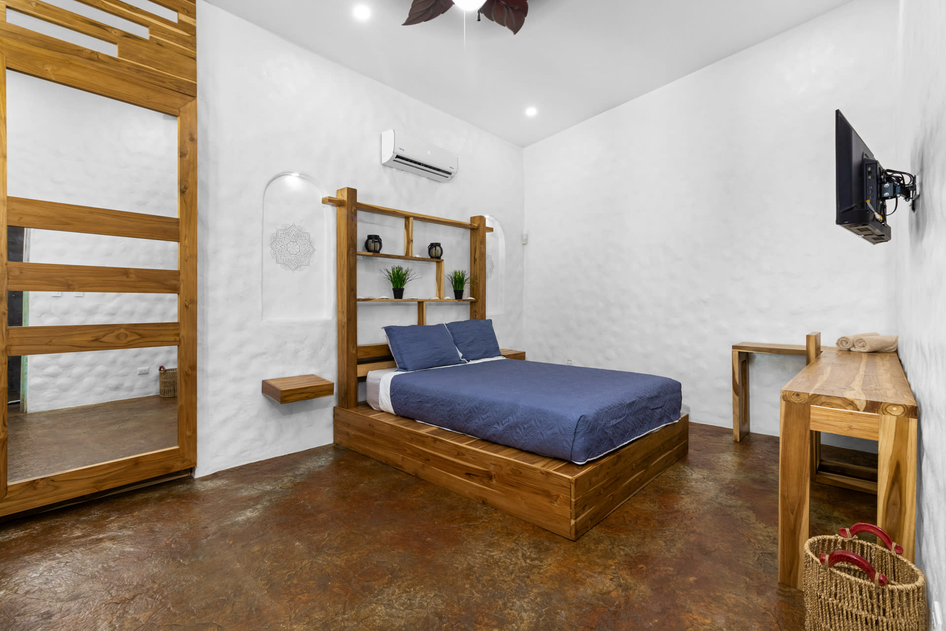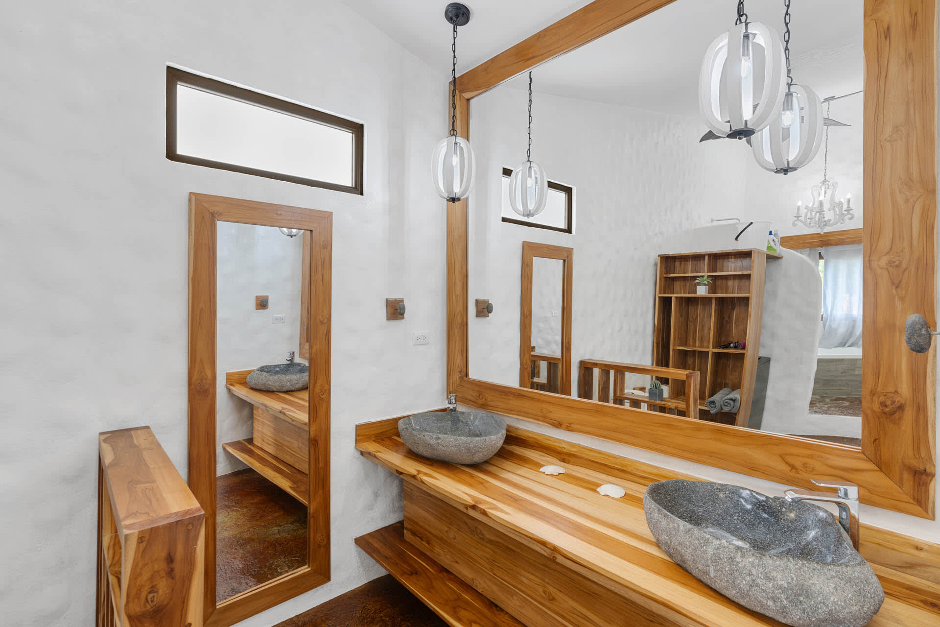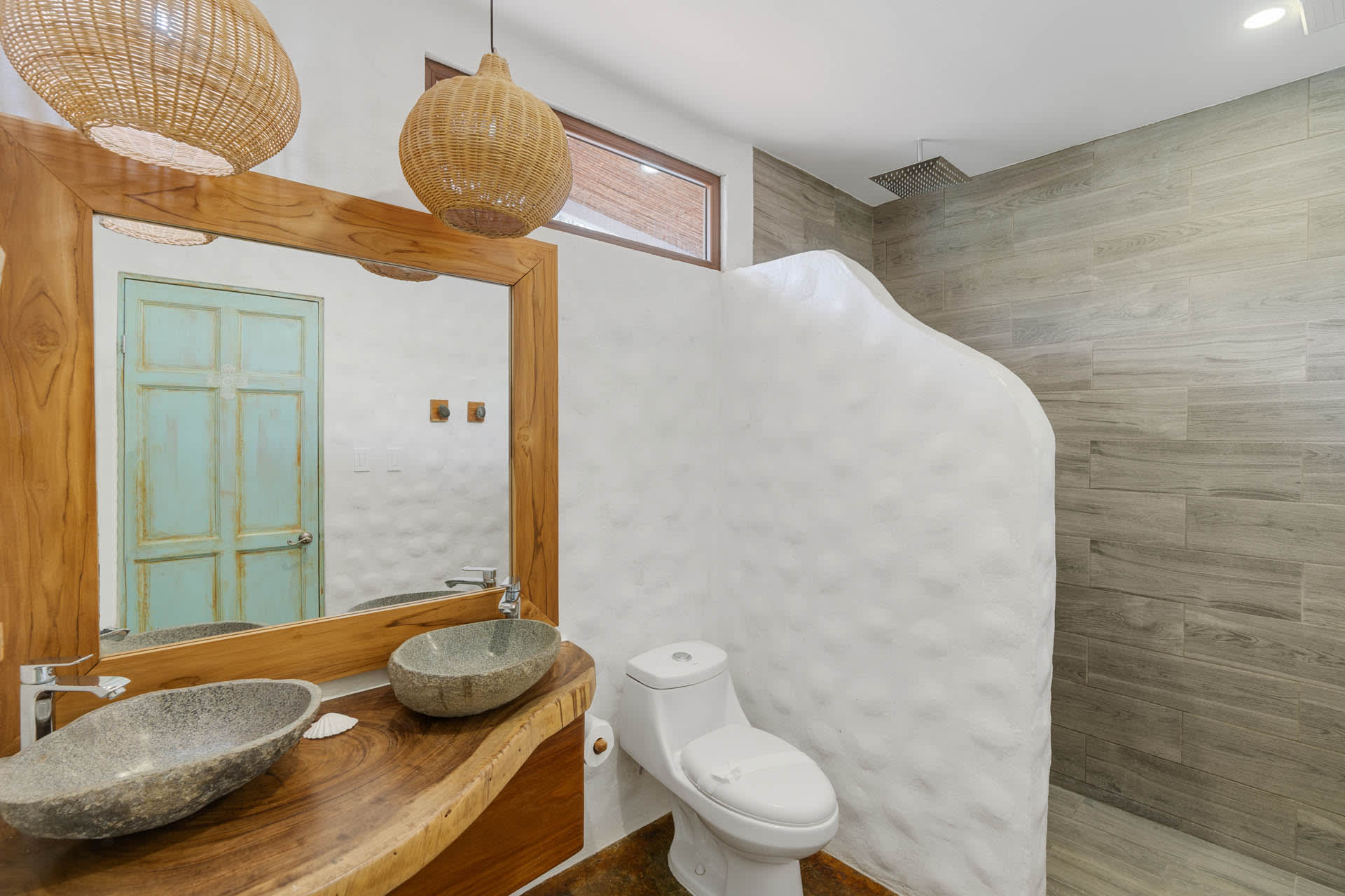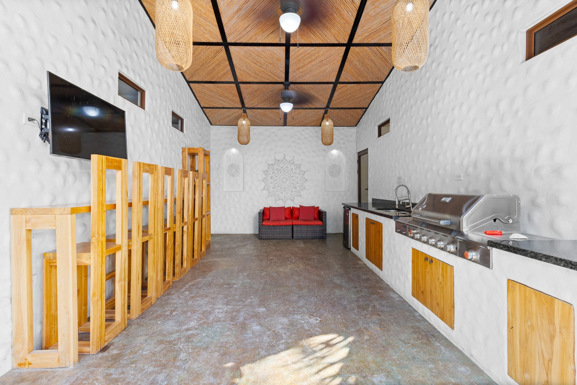 The living room showcases a stylish blue sofa with colorful throw pillows, a flat-screen TV, and a coffee table and floating shelves made from natural wood. The well-lit kitchen is a chef’s dream, featuring high-end granite and marble countertops, open shelving, and cabinets crafted from teak wood, alongside pristine stainless steel appliances, including an oven, gas stove, large refrigerator, freezer, dishwasher, microwave, and a farmhouse sink. The space also features an oversized teak wood island that doubles as a breakfast bar, situated under stylish two rattan light fixtures.