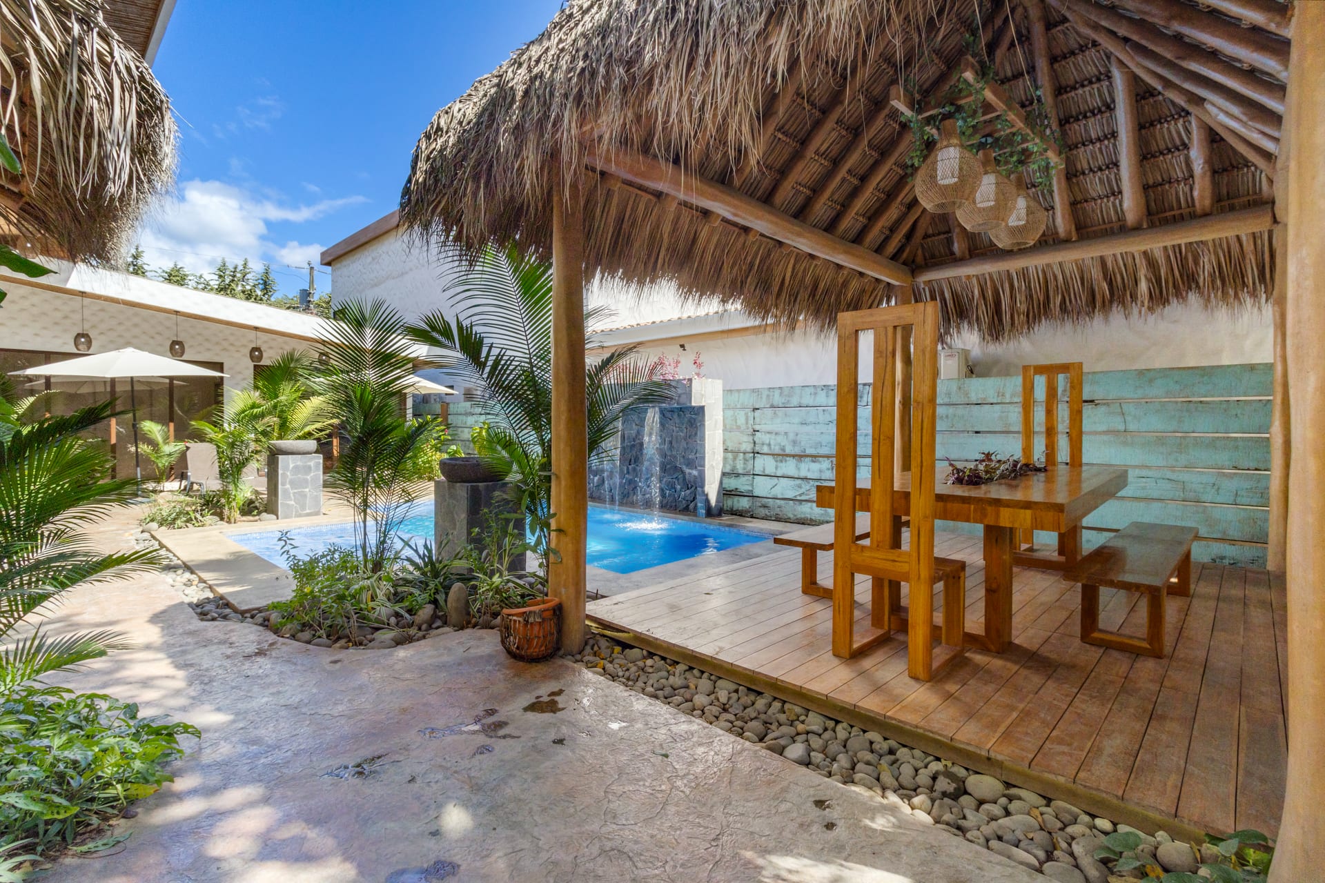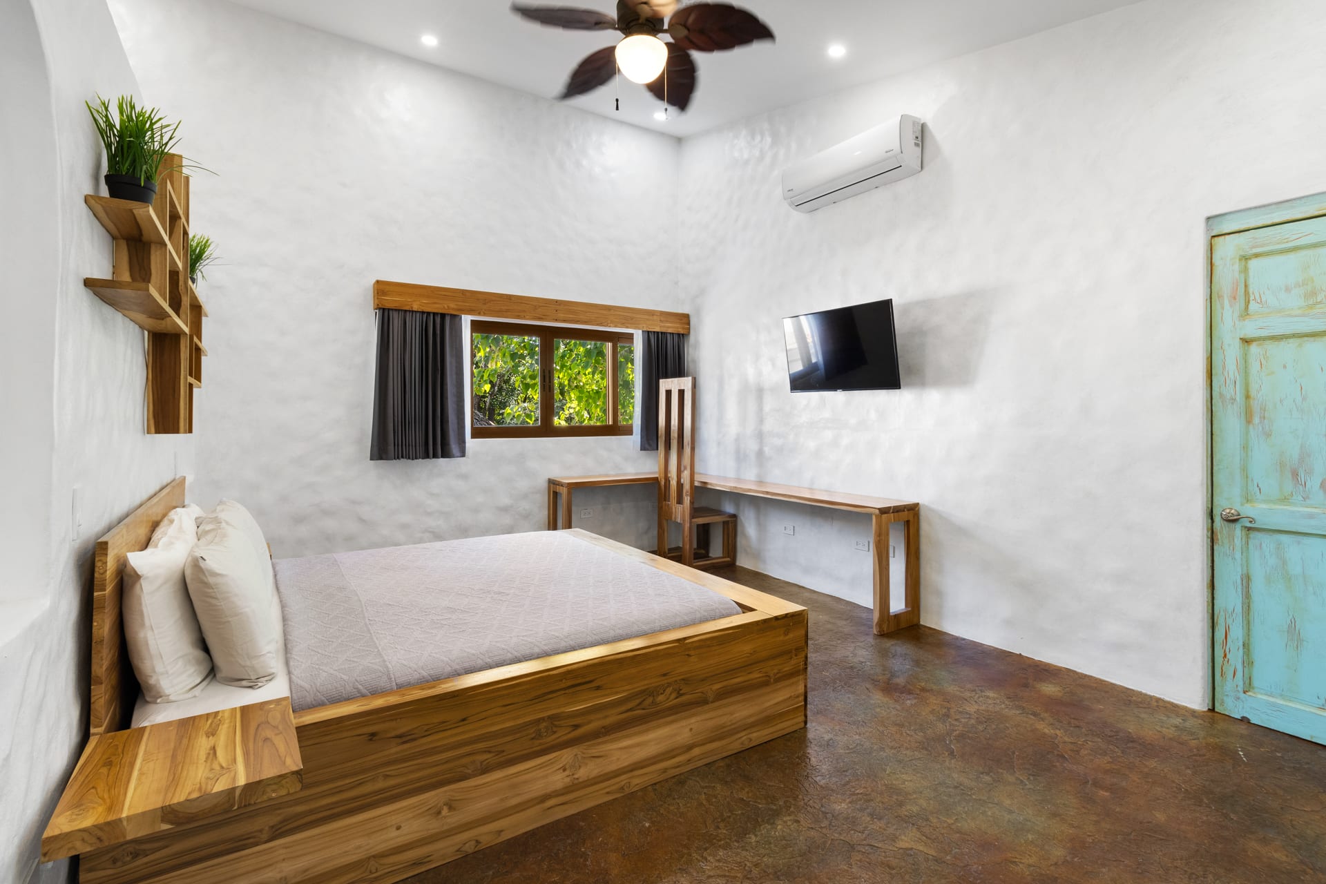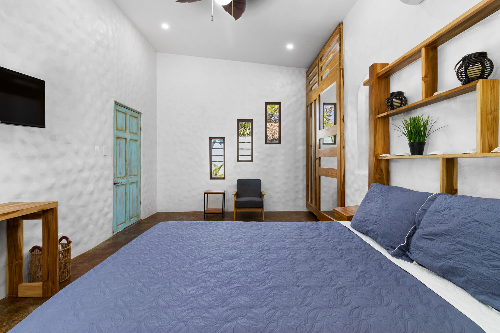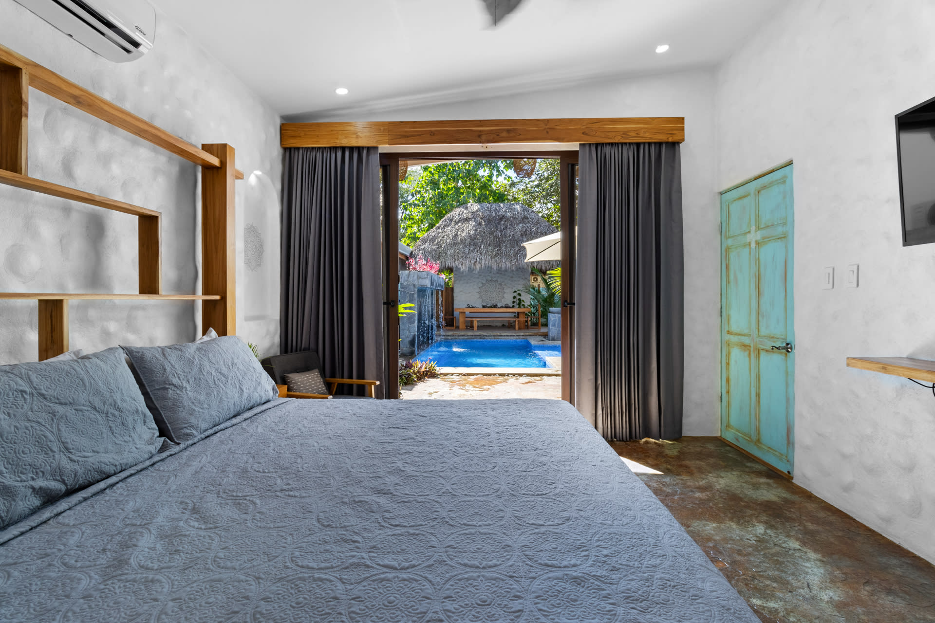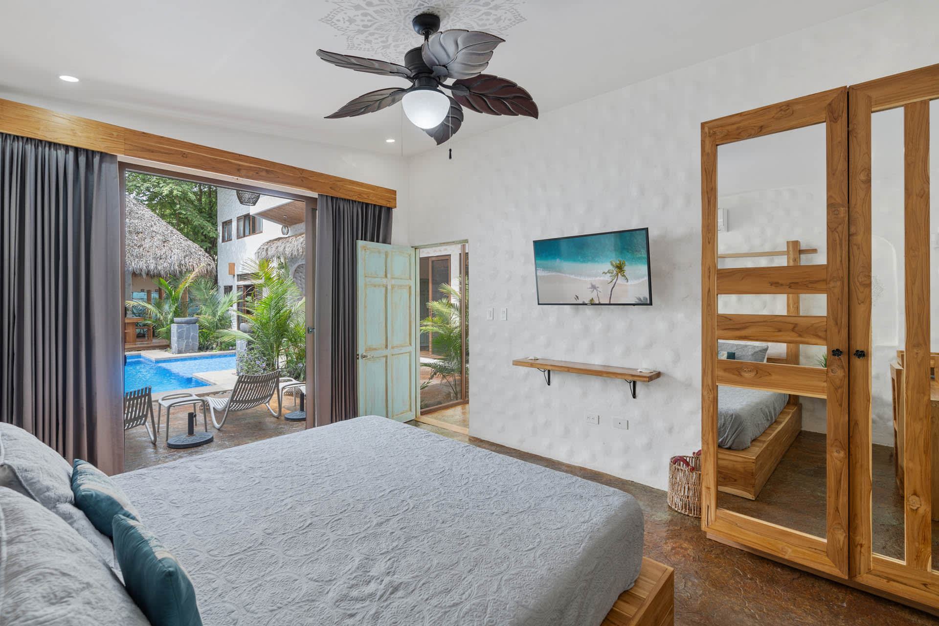 The main home includes three bedrooms. The master bedroom features a king-sized bed and a sliding glass door that leads directly to the swimming pool. This room also features a flat-screen TV and an ensuite bathroom with a double-sink vanity, walk-in shower, and chic design. The two guest bedrooms can be accessed through the turquoise doors on either side of the main home’s entryway, and each features a queen-sized bed, a flat-screen TV, a small sitting area, and a wooden writing desk and chair.