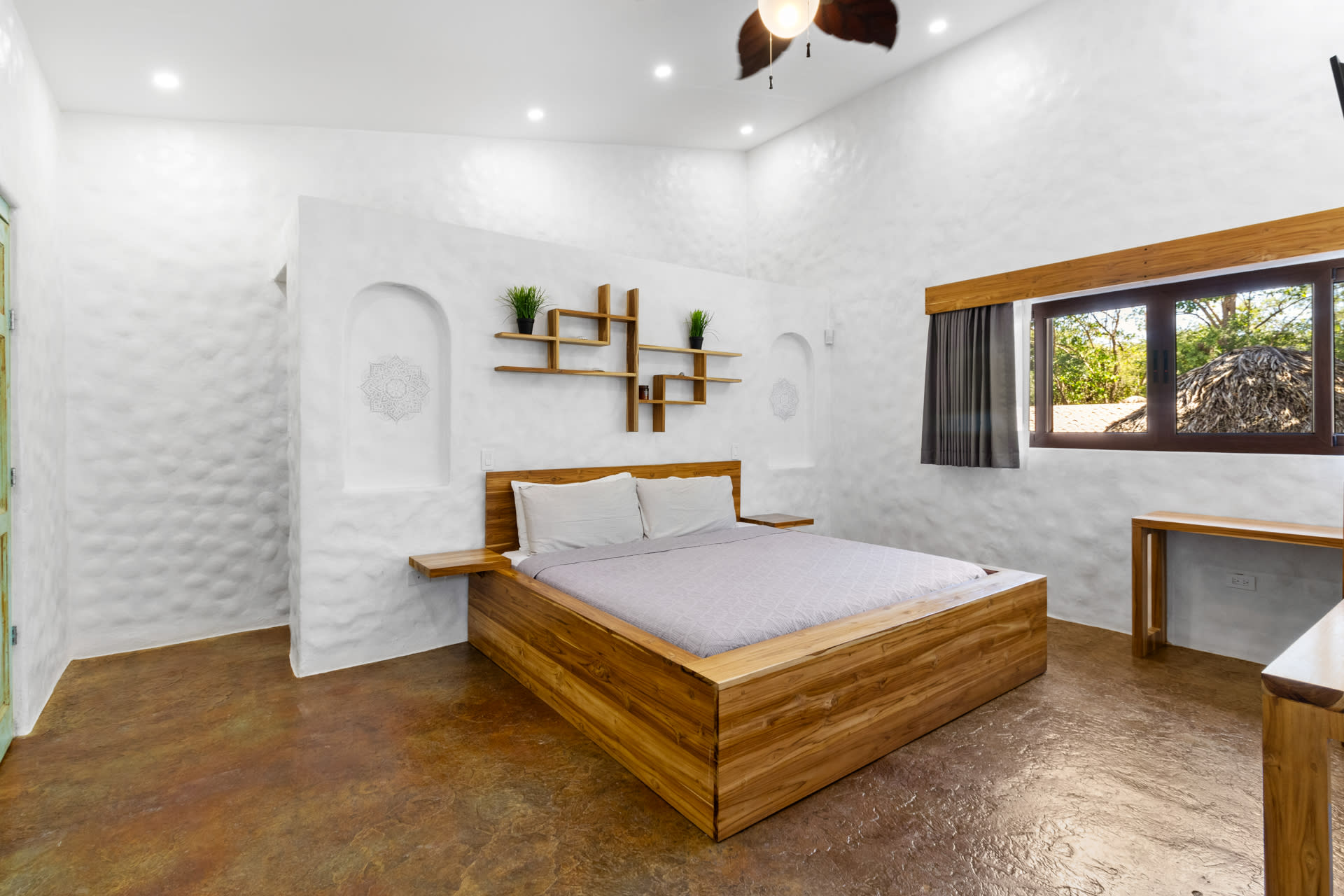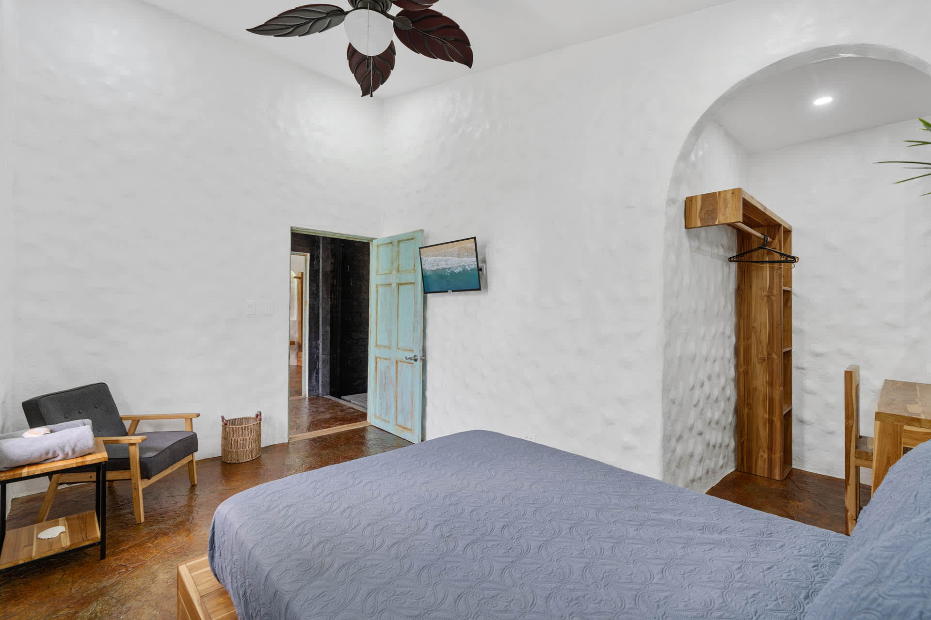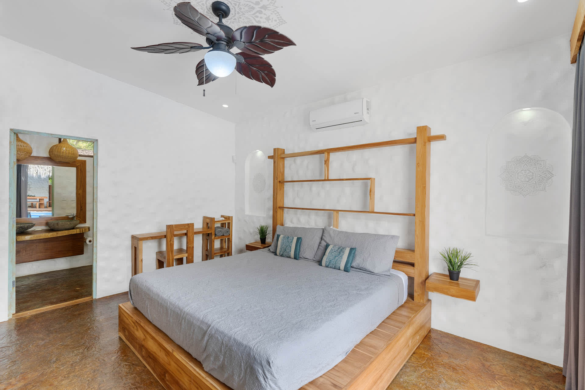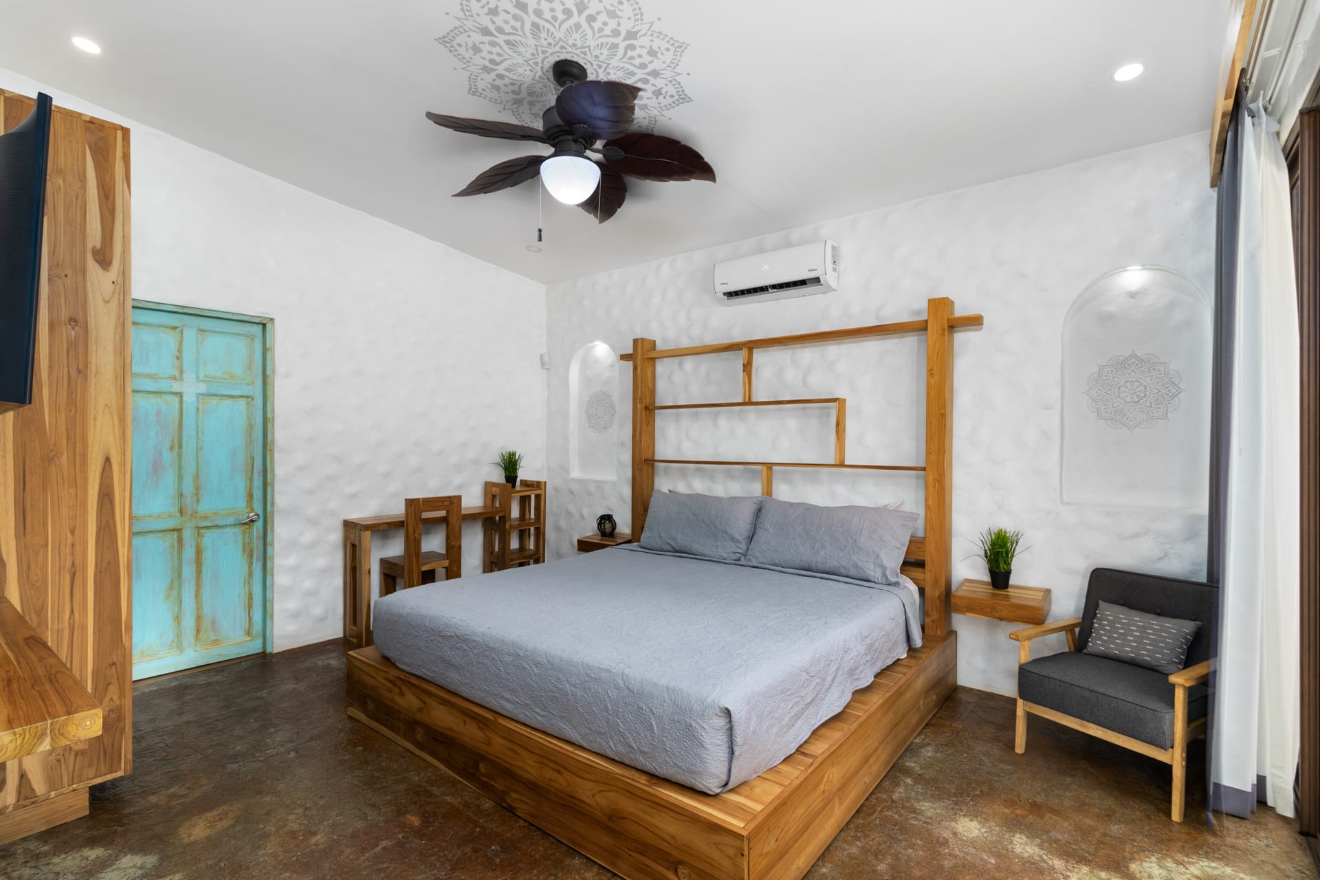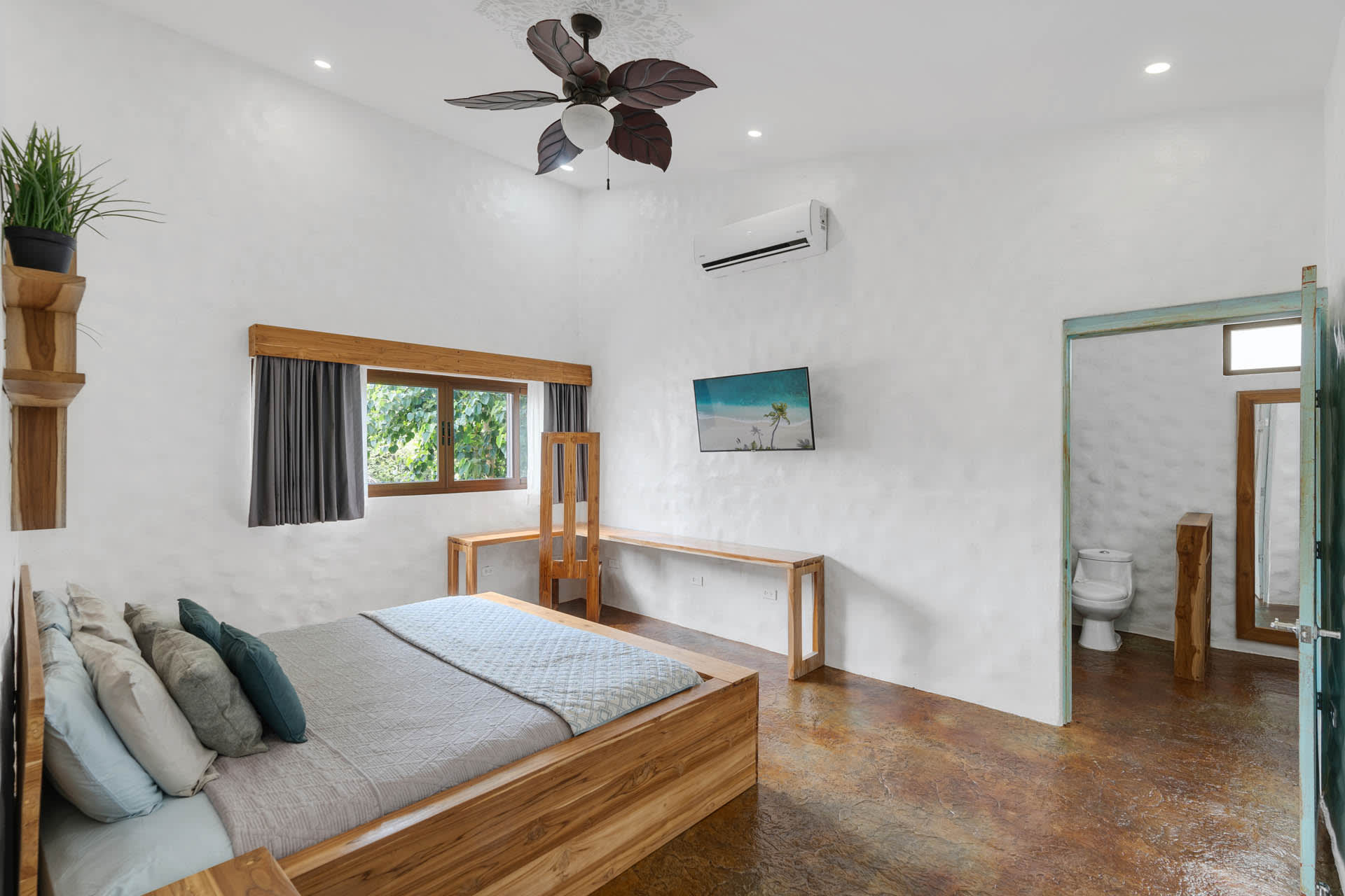 The main home includes three bedrooms. The master bedroom features a king-sized bed and a sliding glass door that leads directly to the swimming pool. This room also features a flat-screen TV and an ensuite bathroom with a double-sink vanity, walk-in shower, and chic design. The two guest bedrooms can be accessed through the turquoise doors on either side of the main home’s entryway, and each features a queen-sized bed, a flat-screen TV, a small sitting area, and a wooden writing desk and chair.