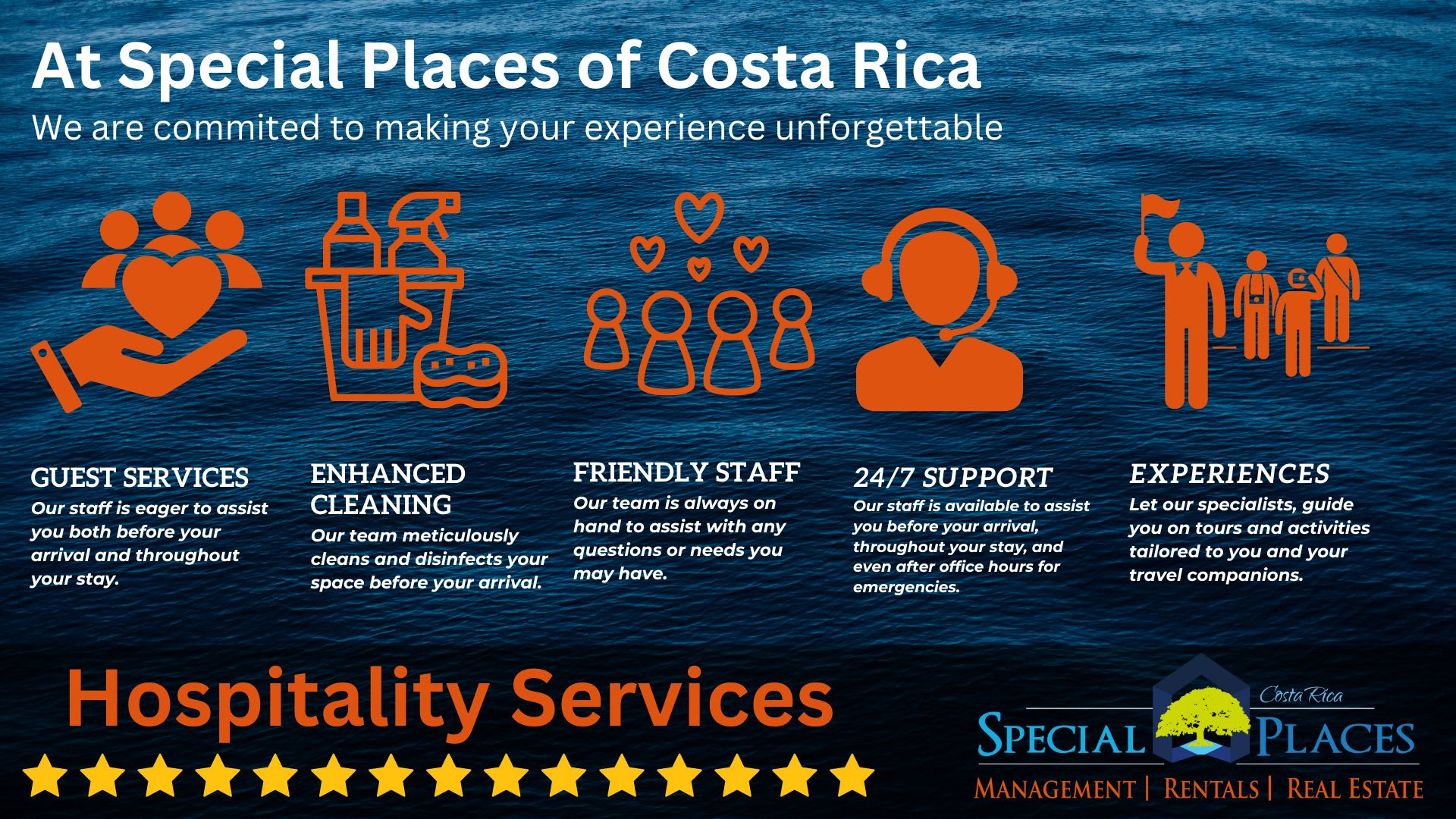 Upon arrival at Casa Las Brisas 5BR, you’ll find a welcome basket filled with coffee, coffee filters, salt, pepper, soap, shampoo, conditioner, toilet paper, paper towels, cooking oil, and other essentials you’ll need for a comfortable stay, courtesy of our team at Special Places of Costa Rica. We’ll also include a bottle of Salsa Lizano, a special Costa Rican sauce that will add a touch of local flavor to all your dishes!