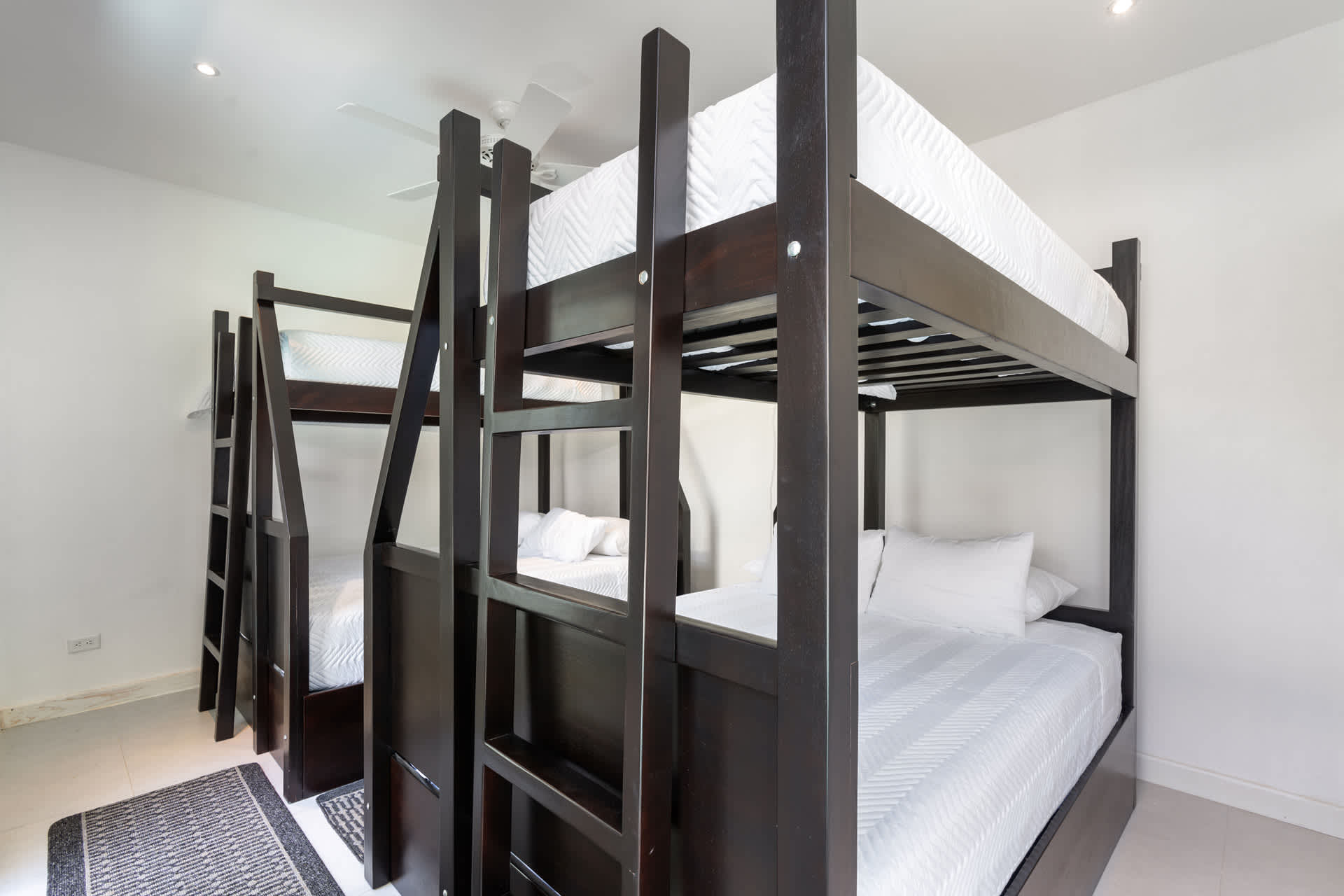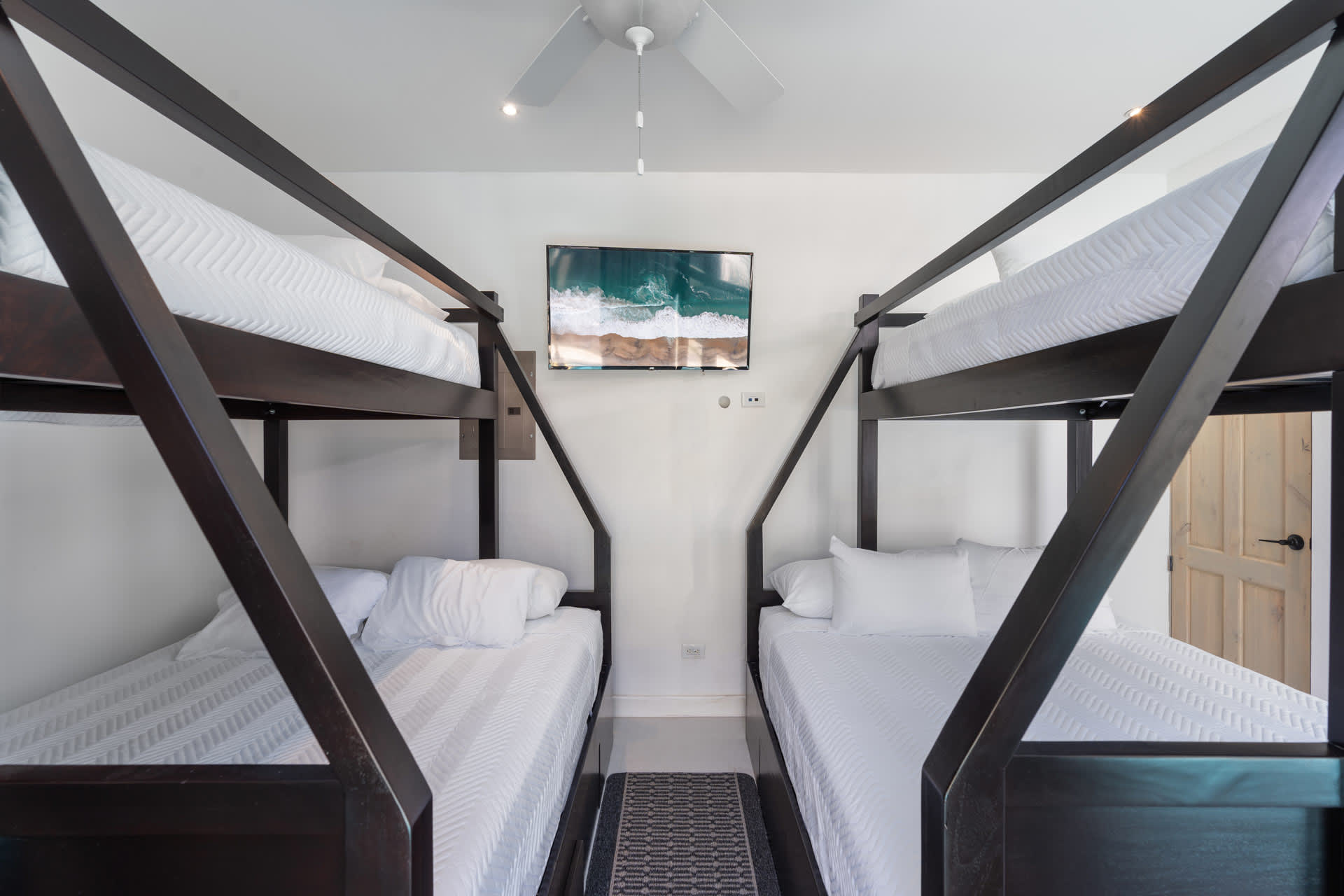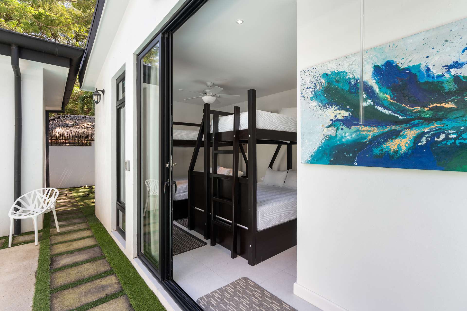 Casa Rio includes five beautifully furnished bedrooms: with two plush king-sized beds and two queen beds in the main house, perfect for larger groups, families, or multiple couples. Each bedroom has air conditioning and its own TV. The home has three full bathrooms with walk-in showers, one with a soaking tub, and a convenient half-bath by the pool. There is also an apartment that includes a king-sized bed, a queen-sized bed, and twin bunk beds. There are no doors between the king-sized bed and the bunk bedroom. With five TVs total and strong Wi-Fi throughout, there’s plenty of space to unwind.