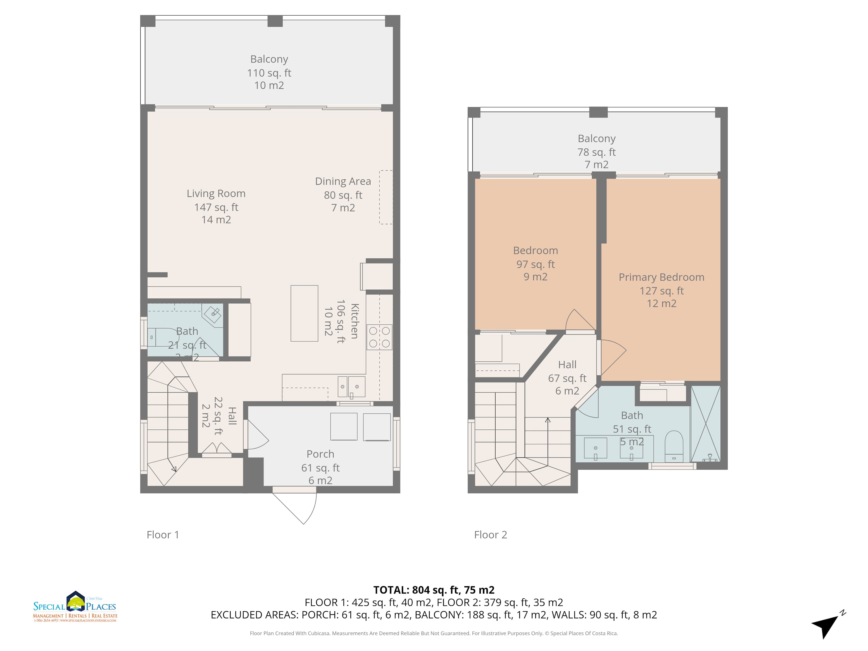 Upstairs, the master bedroom has a queen bed and a private balcony overlooking the gardens, while the second bedroom includes a queen bed plus a twin trundle for flexible sleeping arrangements. Both bedrooms share a modern full bathroom upstairs, while a half-bath is located on the main floor for added convenience.